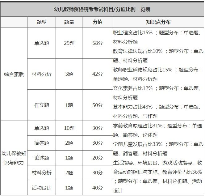 1)幼儿园教师资格考试笔试科目有2科:科目一为《综合素质》,科目二为《保教知识与能力》。