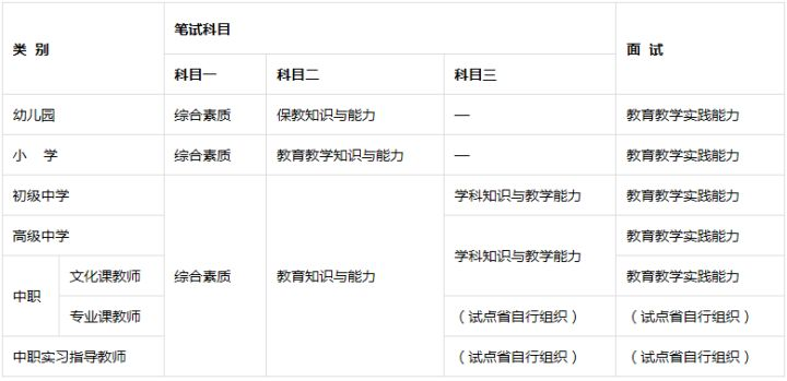 幼儿园不分科目。小学笔试不分科目,面试科目有语文、数学、英语、社会、科学、音乐、体育、美术、心理健康教育、信息技术、小学全科。初中笔试科目三和面试分为语文、数学、英语、物理、化学、生物、思想品德、历史、地理、音乐、体育与健康、美术、信息技术、历史与社会、科学、心理健康教育、日语、俄语等18个学科。普通高级中学和中等职业学校文化课笔试科目三和面试分为语文、数学、英语、物理、化学、生物、思想政治、历史、地理、音乐、体育与健康、美术、信息技术、通用技术、心理健康教育、日语、俄语等17个学科。②报名前了解所在地的考试公告,确定报考条件教师资格证的报名时间、报名条件、注意事项等工作,确保报名工作的顺利进行。