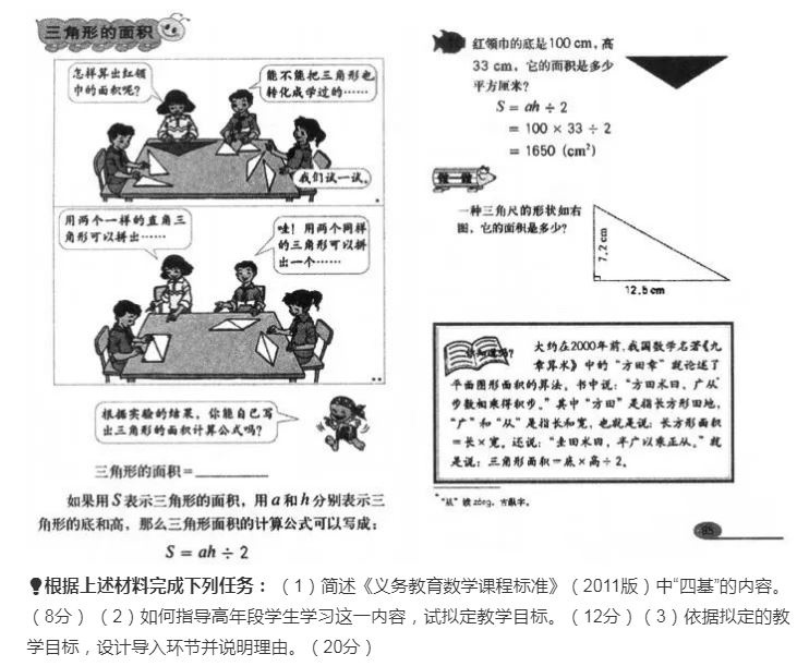 这一科顾名思义,考查的是考生对于报考科目专业知识的掌握和运用程度。也就是说,一是要考查考生对要教学科是不是真的懂,二是要考查考生有没有能力让学生懂。由于考生在报考的时候,大都是选择自己专业相关,或者兴趣相关,所以学科基本知识对于大部分人来说都很简单。这一部分一定要多刷题,题刷得多,套路就明白的多,考试就容易得多。在刷题的基础上,对于简答题做一个汇总,平时做到多读多记多背,考试时最起码要做到言之成理。因此,这一科的难点就在于教学设计、教学实施和教学评价,其中教学设计又是重中之重。教学设计是有套路的,完整的教学设计必备三要素:教学目标、教学重难点和教学过程。教学过程包括导入、新授、练习、总结、作业、板书等重要环节缺一不可。小7反复建议小可爱们多看优秀教师的教案,借鉴其中的长处,考前最好动手写几篇属于自己风格的教案,考试中方可心中有数、下笔有神。