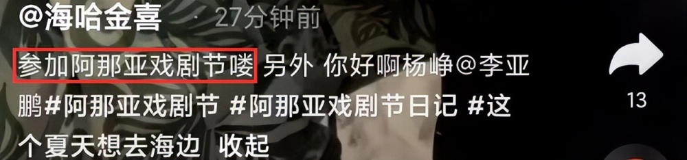 6月22日,农历五月初五,恰逢一年一度的端午节,圈内众星纷纷晒粽子选择出游。端午假期第一天,李亚鹏模特妻子海哈金喜在社交网更新动态,配文称“参加阿那亚戏剧节,另外你好啊杨峥(《将爱情进行到底》李亚鹏饰)”,并Tag“这个夏天想去海边”,心情相当美丽。