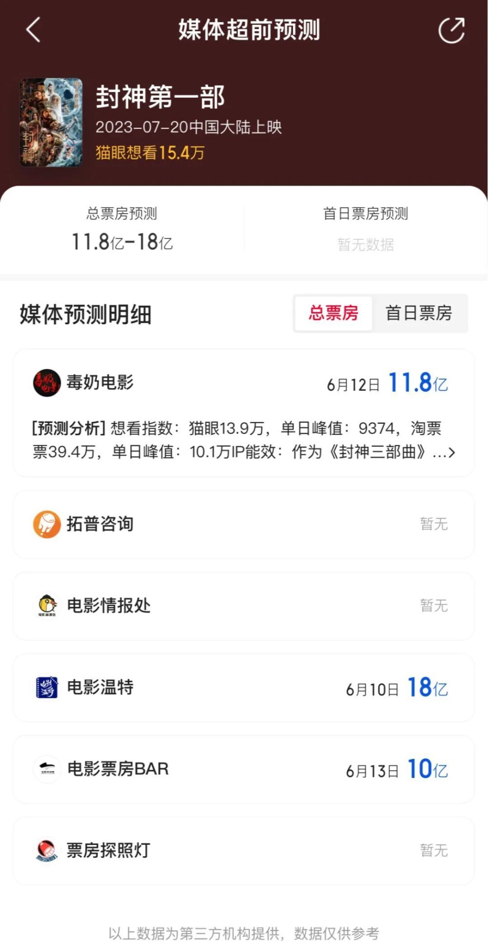 而对于《封神第一部》的票房表现,外界预测也有明显的差距。根据猫眼专业版APP中的“第三方媒体超前预测”,毒奶电影预测票房11.8亿,电影温特预测18亿,电影票房BAR预测10亿。