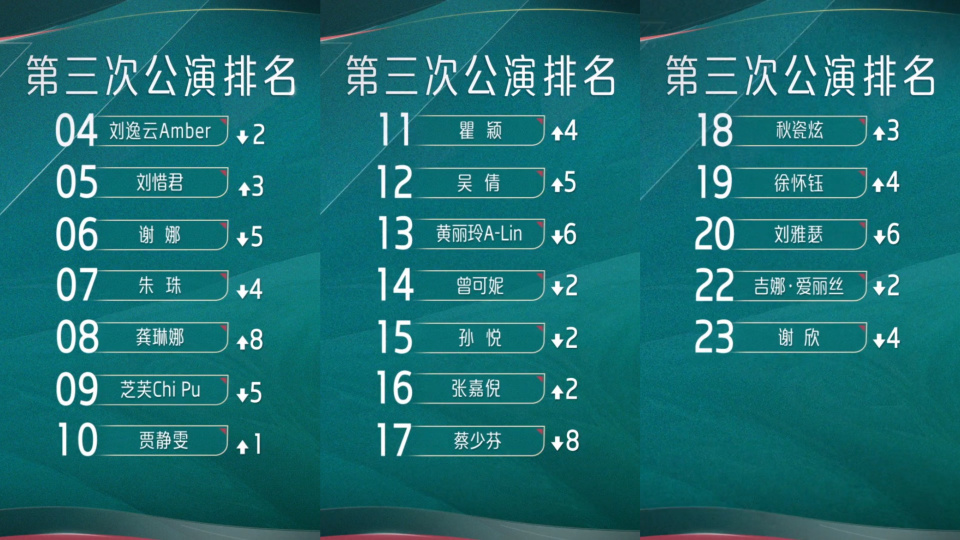 朱珠下滑4名(第7),曾可妮下滑2名(第14),蔡少芬下滑8名(第17),刘雅瑟下滑6名(第20)。