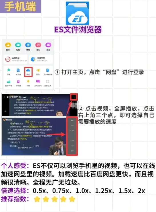说实话,我试过四五个百度网盘视频倍速方法,最后还是觉着ES文件浏览器最好用,最高倍速到x3,完全够日常考研或者看剧的需求,而且页面清晰,直接在ES里面登陆自己的百度网盘账号就可以查看视频,而且支持多个账号,最重要的是免费????(这样的高效app它不香嘛)