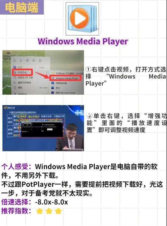 个人感受:windows media player是电脑自带的软件,不用另外下载。不过有个很大的问题就是,你需要提前把要看的视频下载下来,光这步就不满足很多备考党。