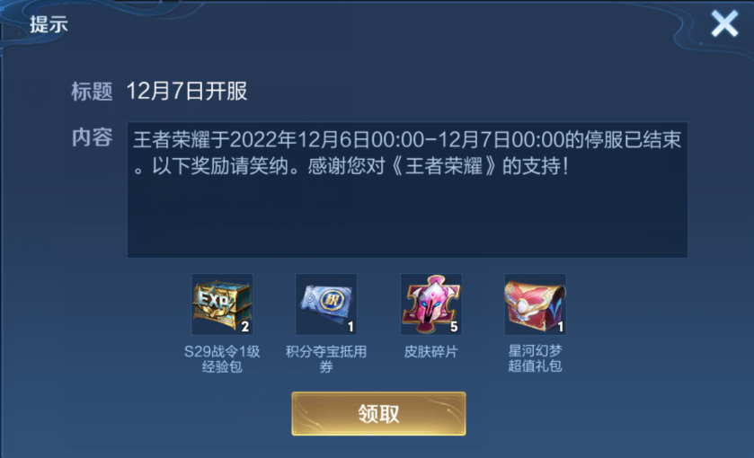 王者荣耀自公测到现在已经七年多,目前也来到了S29赛季的末端,相信大家对于这款游戏都非常熟悉了。在6号,官方也宣布停服了一天,具体原因相信大家也都知道了。而在7号零点,王者荣耀也准时开服了,对于6号的停服,官方也给出了补偿,下面我们一起去看看吧。