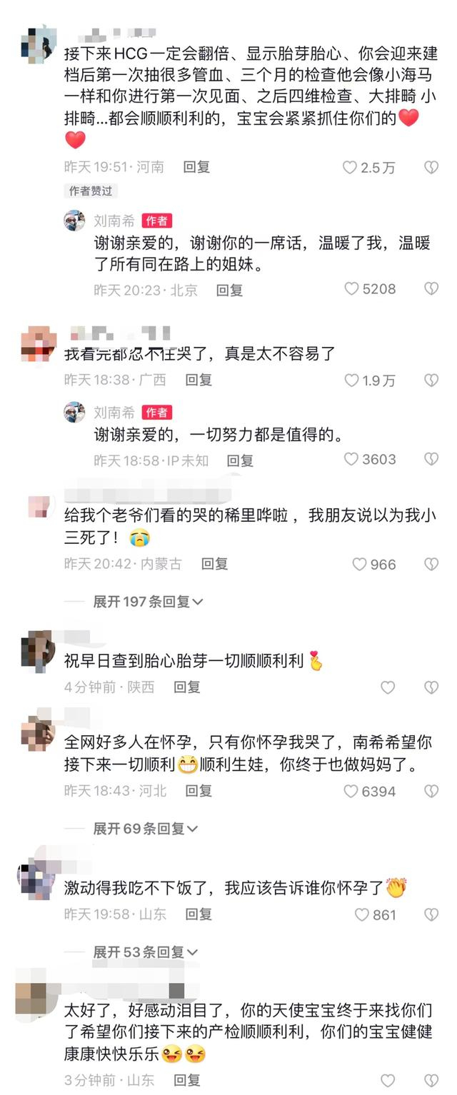 视频曝光后,网友们也非常开心,纷纷在评论中分享自己的怀孕心得,希望能帮助到这对新手爸妈,甚至还有不少人透露,自己跟着刘南希夫妇一块激动地哭了起来。而网友们之所以这么激动是因为刘南希怀孕真的太不容易了。