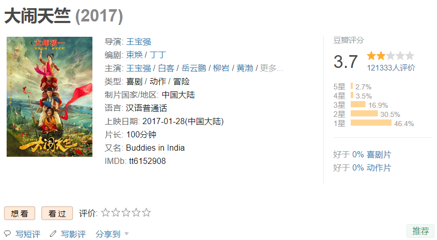 六年前,也就是2017年,由王宝强自导自演的动作喜剧《大闹天竺》成为了年度口碑烂片。有十多万观众在豆瓣网上,打出了3.7的分数,此外该片还让王宝强获得了金扫帚奖最令人失望导演奖。