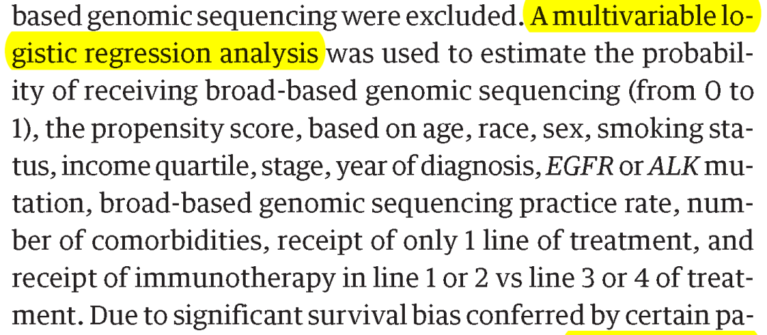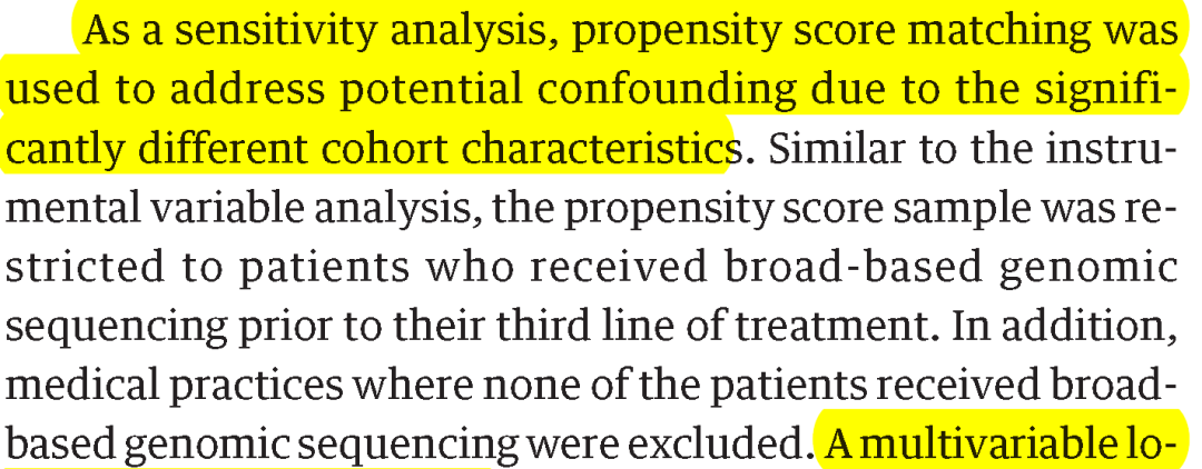 本篇JAMA论文用了两种方法评价了广泛基因测序对肺癌患者生存的影响。一种是工具变量法;另外一种是倾向得分匹配作为敏感性分析。