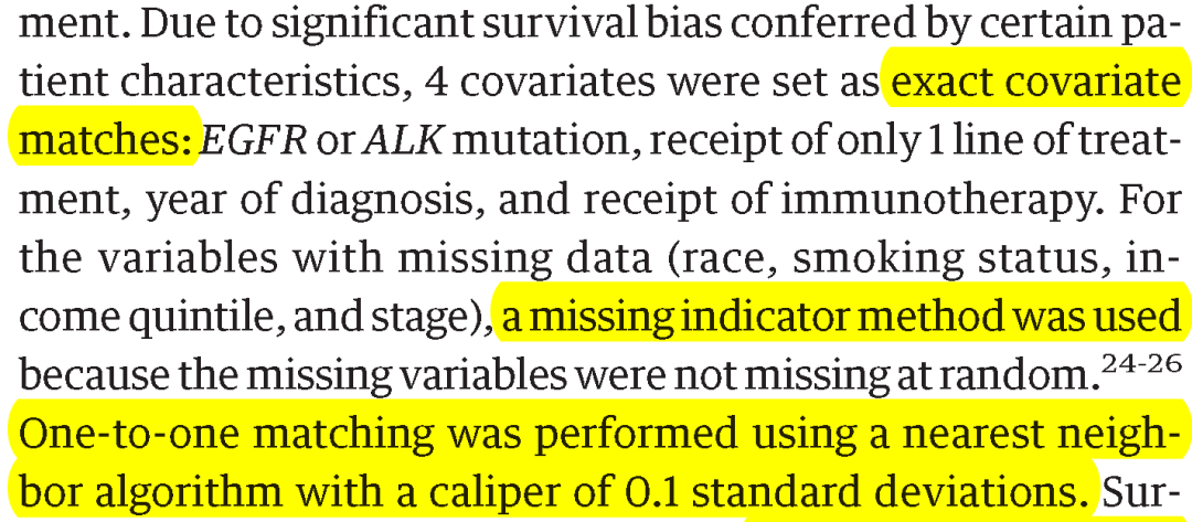 8.当某些患者特征存在显着的生存偏倚时,设置为精确的协变量匹配;对于缺少数据的变量,使用缺少指标的方法;使用卡尺为 0.1 个标准差的最近邻算法进行一对一匹配