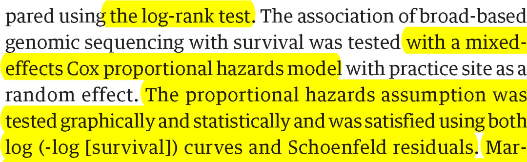 10.广泛的基因组测序与生存的关联使用混合效应 Cox 比例风险模型进行测试,其中实践地点作为随机效应。比例风险假设通过图形和统计方式进行了测试,并且使用对数 (-log [生存]) 曲线和 Schoenfeld 残差得到了满意的结果