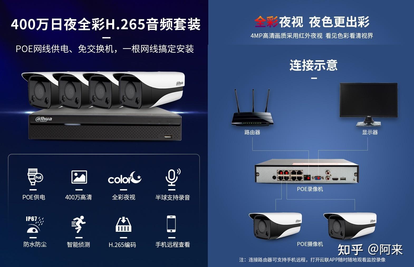 具体可以参考知名安防品牌大华的一款400万日夜全彩套装,POE供电,日夜全彩,功能全面,安装使用简单。