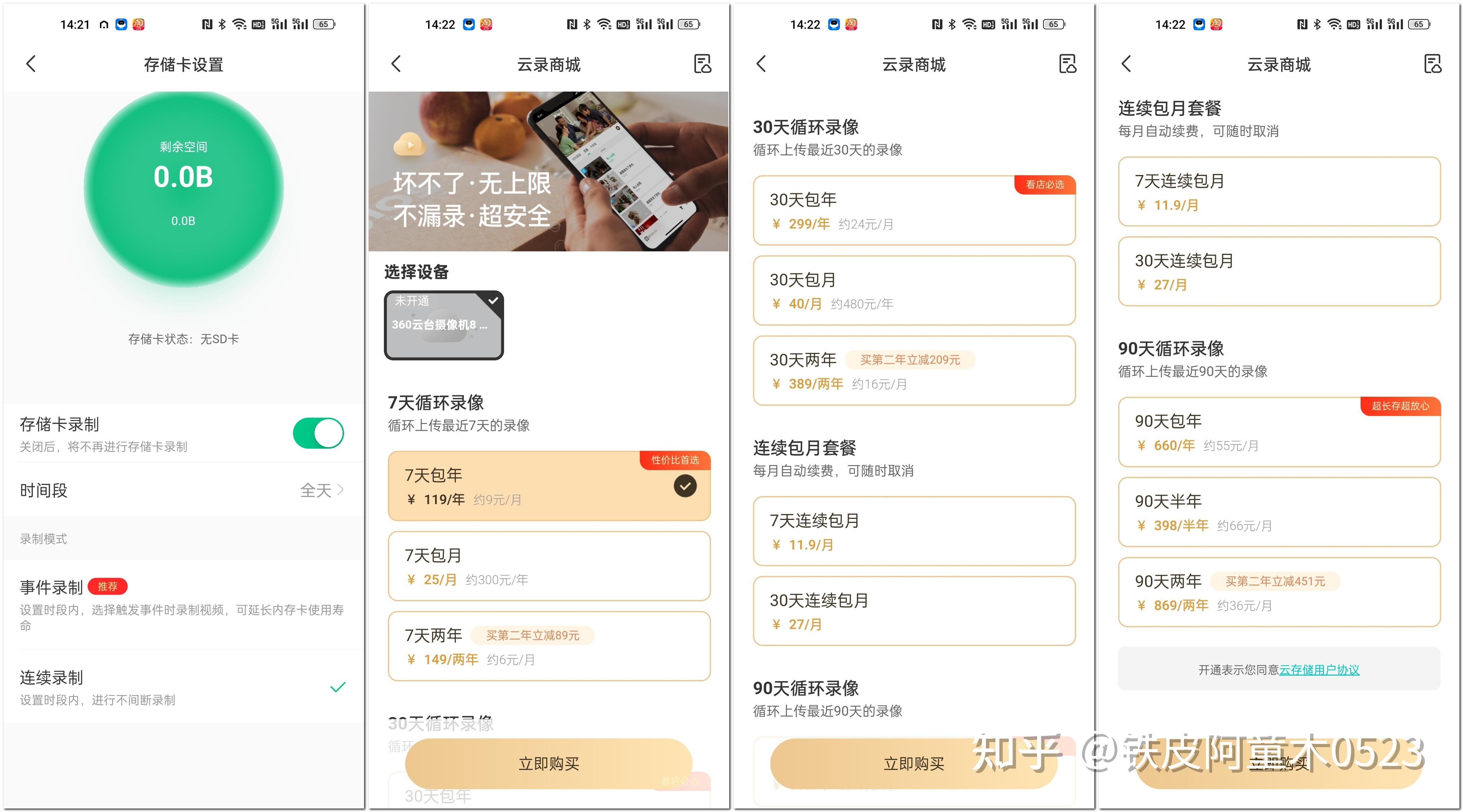 云存储可选择七天循环录像、30天循环录像、90天循环录像不同程度可供选择,最低是6月每月,最高大概是55元每月。