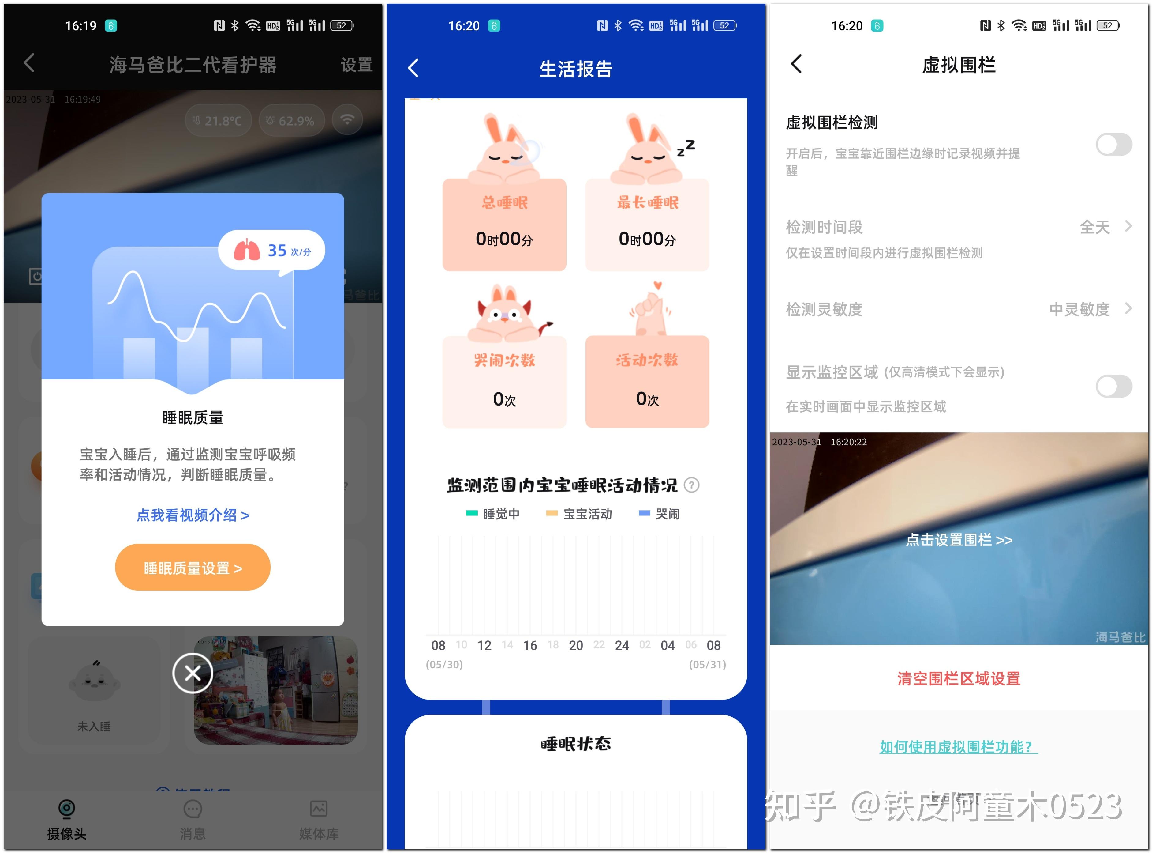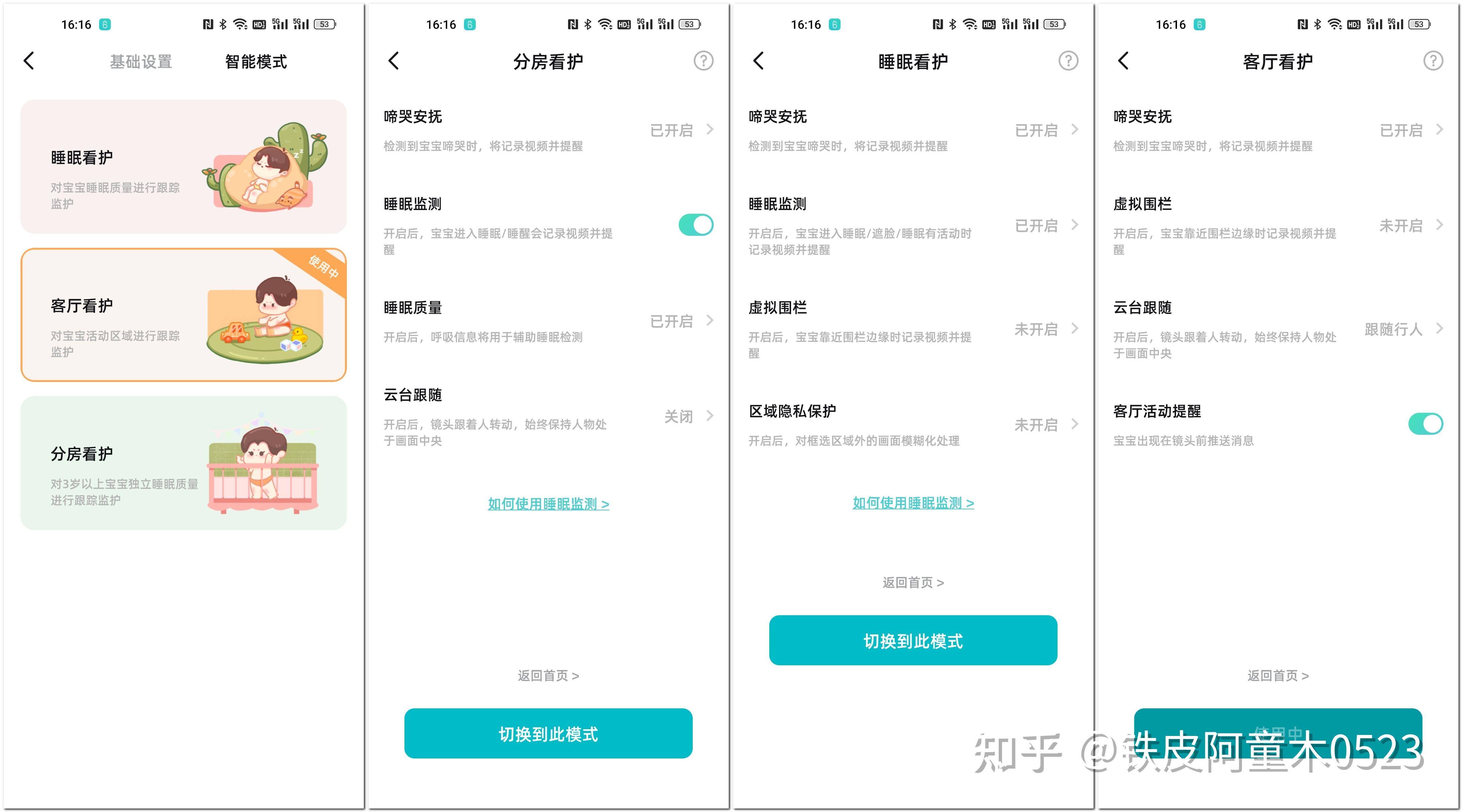 海马爸比定位就是看护儿童,因此对于宝宝的不同状态也预设了三种不同模式,分别是睡眠看护、客厅看护、分房看护,不同模式中设有不同的监测。