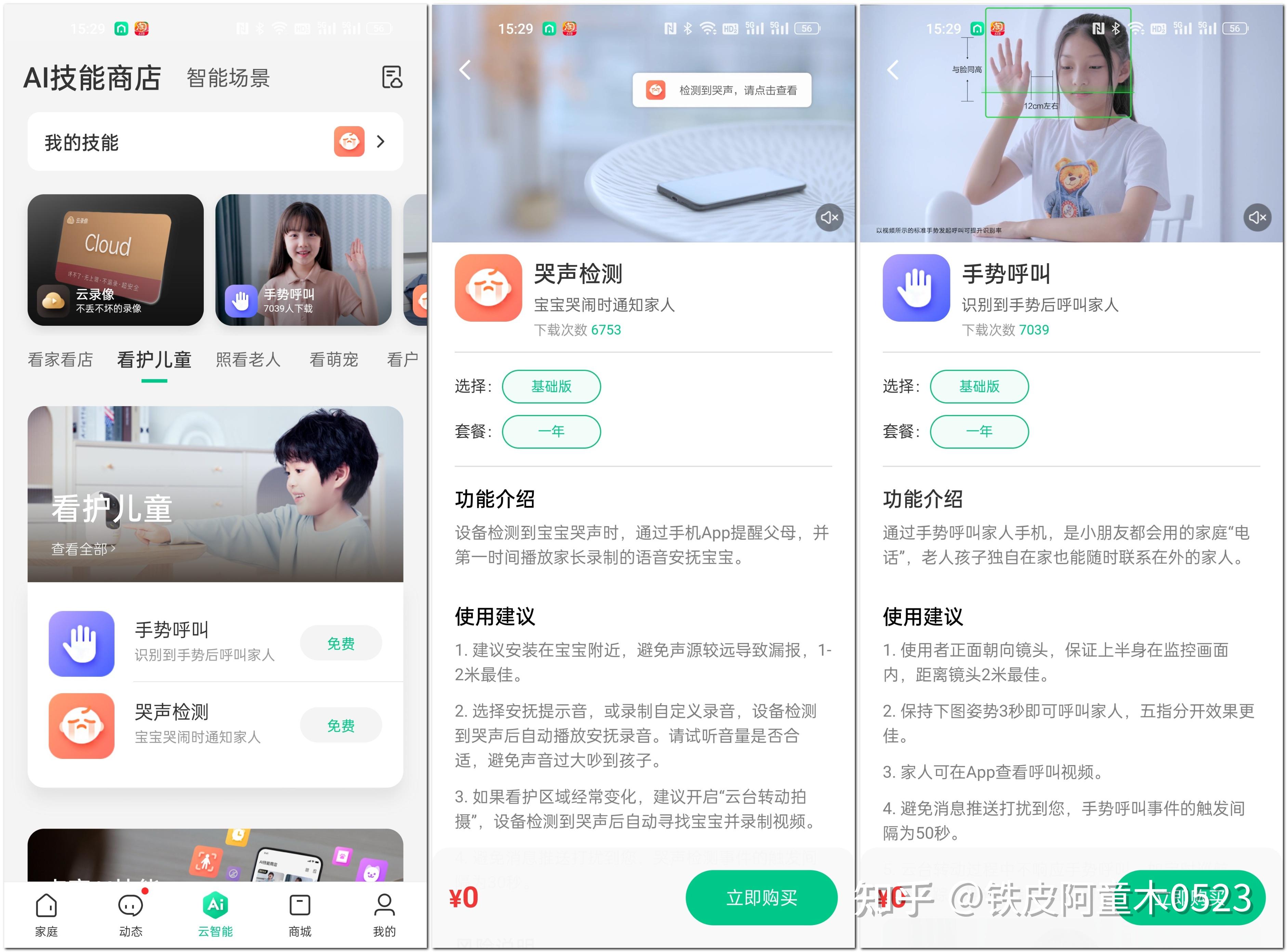 就我个人而言,看护儿童中手势呼叫、哭声检测等很是适用。如果检测到宝宝哭闹,可自动跟拍,且可设置播放安抚音乐并APP进行推送告知宝爸宝妈。手势呼叫也是三款摄像头中,唯一一款具备此功能的,除了对于孩子来讲操作简单外,对于独自在家的老人也是十分受用,操作简单方便,可及时与家人进行沟通。