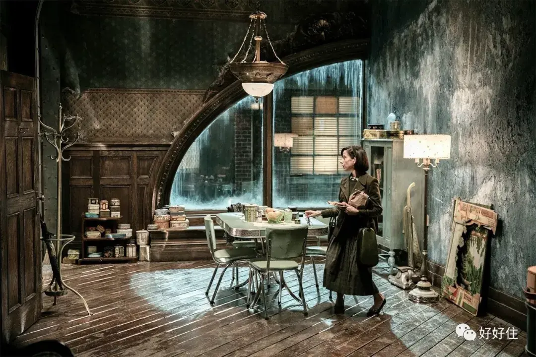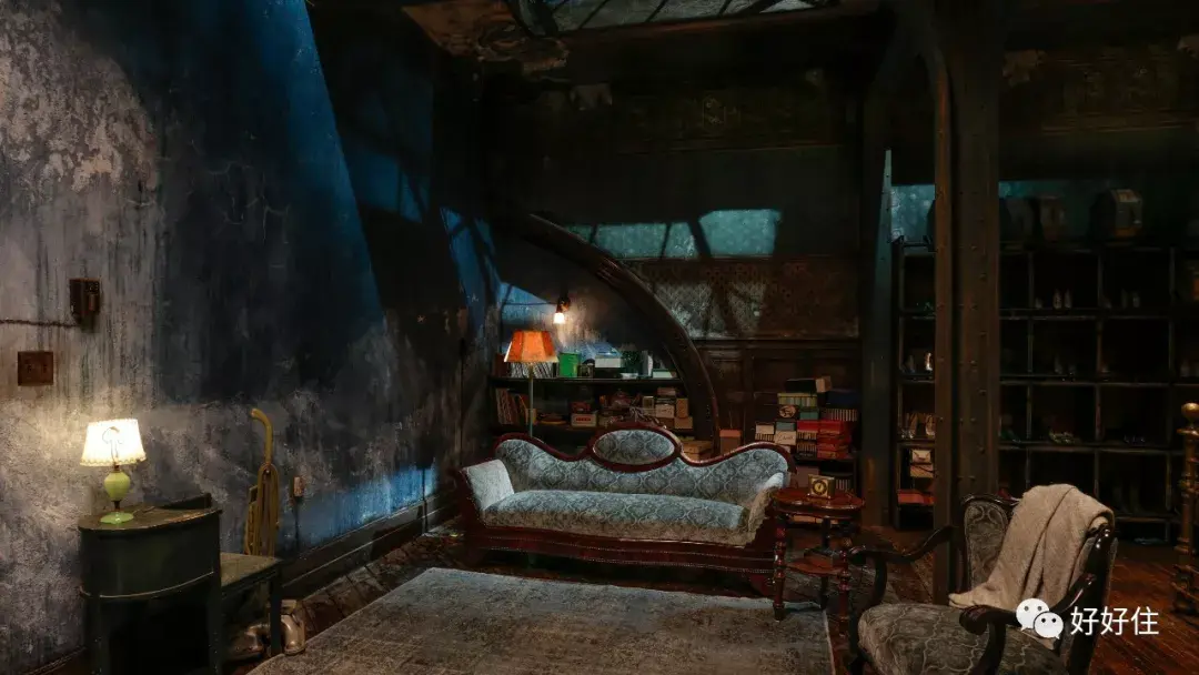 ▲ 电影中女主人公的家,斜铺做旧的木地板中和了各种冷色调的墙面与家具,扇形的巨大落地窗是她家最大的亮点。电影中的浪漫与童真在布景中也得到体现——建在电影院上的阁楼房,潮湿斑驳的墙面,不同图案拼接的墙纸,和各种不规则的窗户与门洞,都赋予了这部电影浓浓的童话色彩。