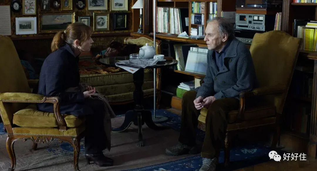 ▲ 法国著名女演员 Isabelle Huppert 在片中饰演老两口的女儿,心疼于父母的处境却无能为力,剧照为两人坐在起居室讨论母亲病倒后的安排。电影的场景几乎全部在老两口的居所里拍摄,芥末绿的丝绒沙发,欧式壁灯与实木小圆桌都非常凸显剧中角色对生活品质的要求。而整面书架,CD播放器,照片墙和各种证书也都透露着这是一个知识分子家庭,在起居室的另一角还有一架三角钢琴,女主角病倒前常常演奏给丈夫听。