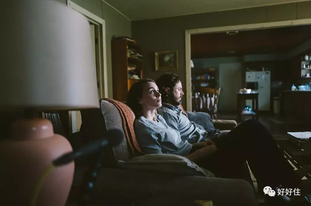 ▲ 披着床单的幽灵由去年的奥斯卡影帝 Casey Affleck 饰演,全程露脸不超过十分钟,台词也只有寥寥几句。但仅凭一个守望的背影,一个回头,就足够让人感受他的演技。这对恋人的家是一个典型的美式平民自建房,硬装非常简单,户型也是方方正正的一眼到底,分为餐厨区,起居区,和卧室区。虽然简单,但处处透着温情。房间里大量使用了淡雅舒适的纺织品,配上不同色系的木质家具,尽显岁月静好的小温馨。
