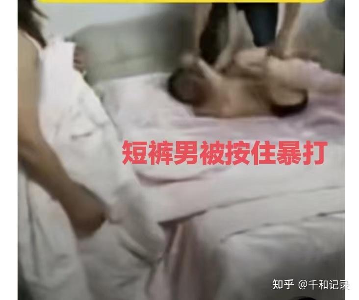 视频中一名身穿性感睡衣的中年女子抱着床单护在胸前,床上一名年轻且身形较瘦只穿了条内裤的男子被两名黑衣男按住暴打。