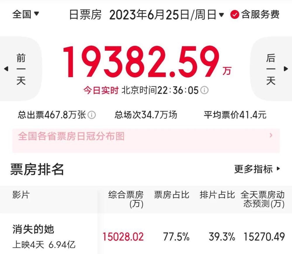 影片上映后的第一个工作日,《消失的她》的票房不仅早早破亿,还以39.3%的排片占到77.5%的票房,厉害得如此逆天!票房占比将近排片的两倍了,可以算排片严重不足了!