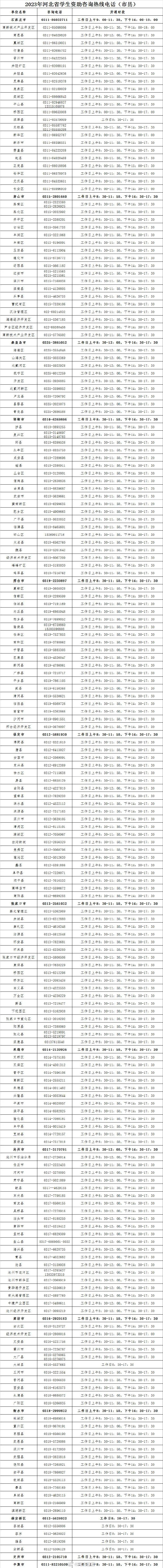 河北省各高校和各市县资助热线电话见附表。了解更多资助政策,请关注“河北省学生资助”微信公众号。