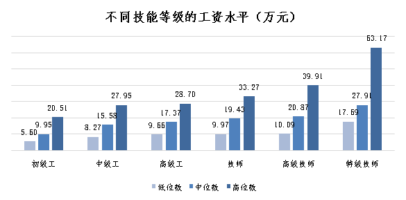 从工资中位数看,首席技师工资超初级工3倍。首席技师、特级技师、高级技师、技师、高级工、中级工和初级工分别为30.33万元、27.91万元、20.87万元、19.43万元、17.37万元、15.58万元和9.95万元。
