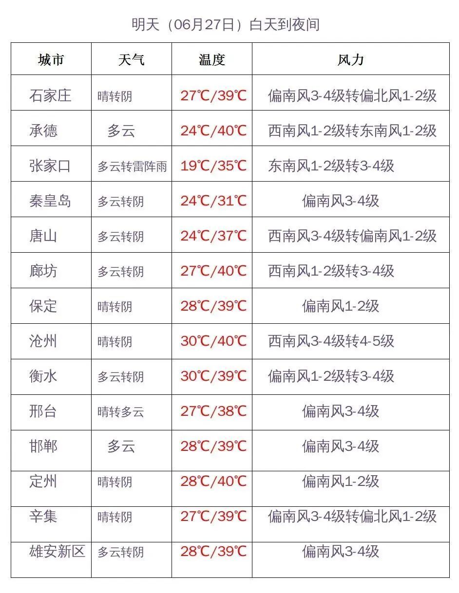 河北省气象台2023年06月26日16时27分发布高温红色预警信号:预计明天白天,张家口中部、承德中部、唐山中北部和保定、廊坊及以南地区最高气温将达到37~39℃,局地可达40℃以上。请防范!(中国天气网、中央气象台、河北省气象台)