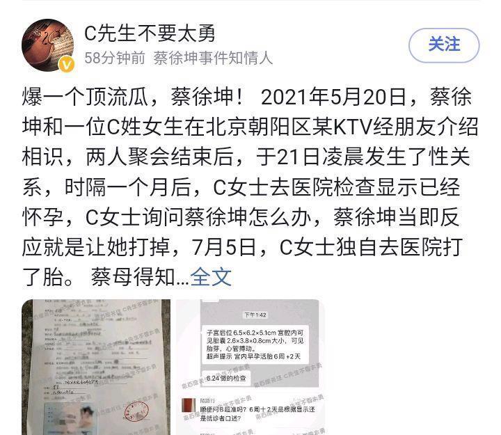 目前,关于蔡徐坤的更多爆料进一步爆出中,作为通过选秀被广大网友熟知的他,这一次已将彻底塌房。 #蔡徐坤一夜情致女方怀孕#