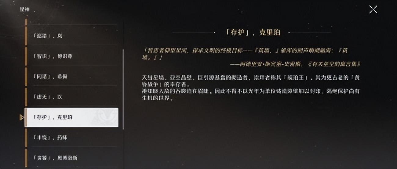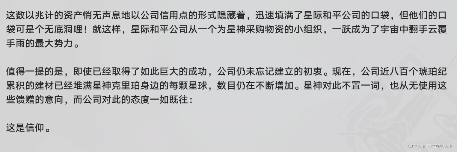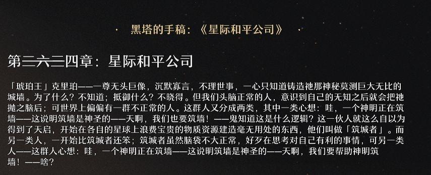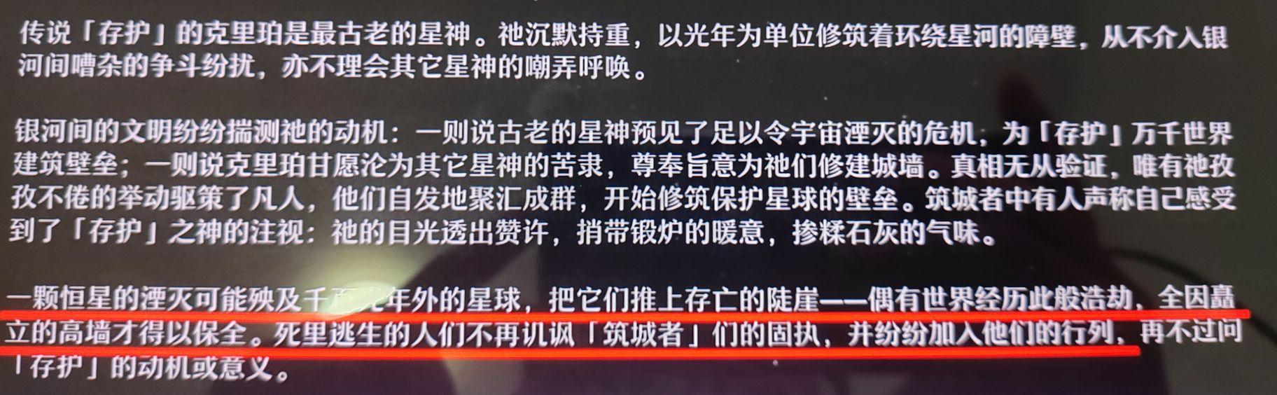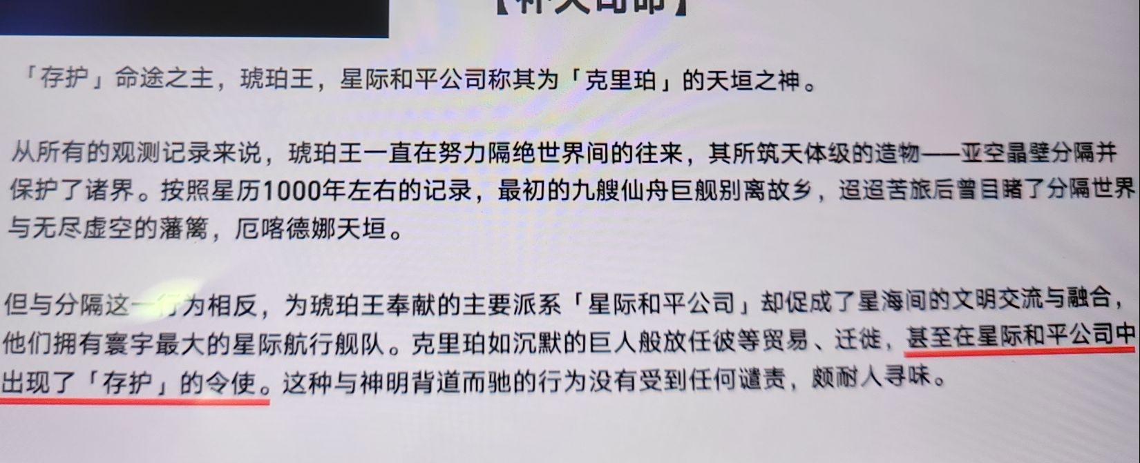 命途为星神所行之道,而「存护」的命途体现为“等待、牺牲、保护的行为”,并不具备诸如预知未来之类的能力。同时,「欢愉」的阿哈评价克里珀为“存护是个呆子”,大致能推测「存护」自诞生起便要筑墙抵御的外敌应该也只有「贪饕」奥博洛斯。(很符合我对石头人的理解)游戏内「黄昏战争」的详细内容没有进一步披露,具体当时发生了什么也不说所以到底是什么促使了「存护」和「贪饕」的诞生?这需要更多对于「黄昏战争」的信息,期待后续的相关剧情。星际和平公司克里珀一直单独的蒙头造墙,什么也没对普通生物说,有一群人看见后自发的组织聚集在一起组建了后源队给克里珀收集各种造墙材料(这就是星际和平公司前身)