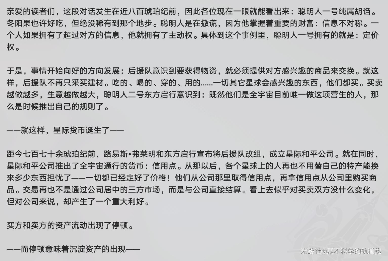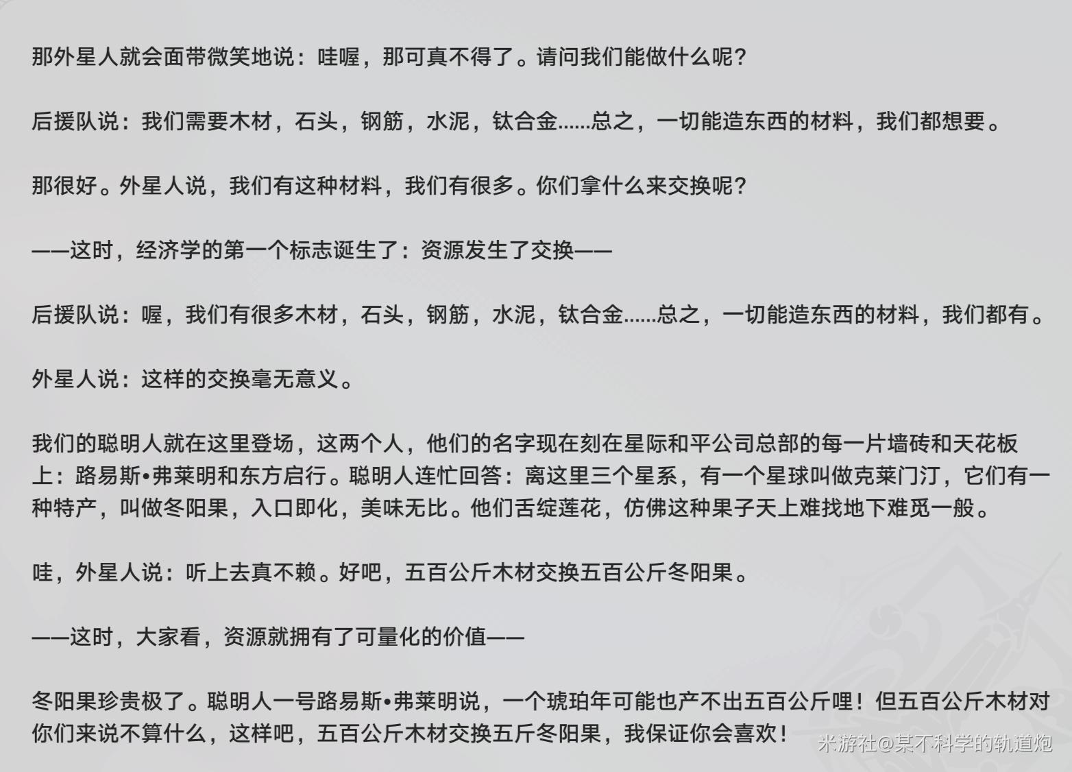 一开始的宇宙没有通用货币,后援队到处以物易物,慢慢在两个人的带领下(星际和平公司创始人东方启行与路易斯?弗莱明)发现了各星球资源的不平衡与信息差获得了定价权开始了宇宙倒爷之路