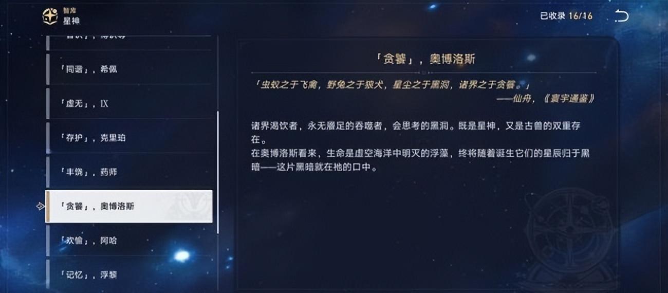 黄昏战争后,克里珀升格为守护星神,「贪饕」奥博洛斯是最后一只留存于世的古兽。(奥博洛斯踏上了贪餮命途开始了永无止境的吞噬,最终会吞噬整个宇宙)