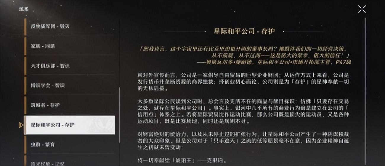 在这一步,后援队通过自己穿行于不同星球间优势,将贸易做大了无数倍。把生意做大的后援队改组成立了星际和平公司,并且推出了全宇宙通行的货币:信用点。甚至制定了宇宙通用年历“琥珀纪”,从守护星神诞生开始算守护星神每砸一锤就是1琥珀纪(76年到240年不等)目前游戏时间是2158纪做完这一步,星际和平公司成为全宇宙的最大的财团已经是板上钉钉,一个能够发行通用货币的贸易组织,放在现实中是完全无法想象的。通过信用点,星际和平公司迅速积累了巨额的财富,一跃成为宇宙中最大的财团。守护星神的追随者成为宇宙第一财团,垄断了一切确实有点黑色幽默了。但星际和平公司虽然垄断了整个宇宙的贸易,但每年还是会把资本用来购买各种材料送到琥珀王身边,帮助造墙。所以公司内部也有被守护星神赐福的守护令使