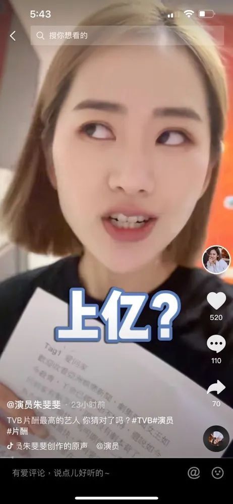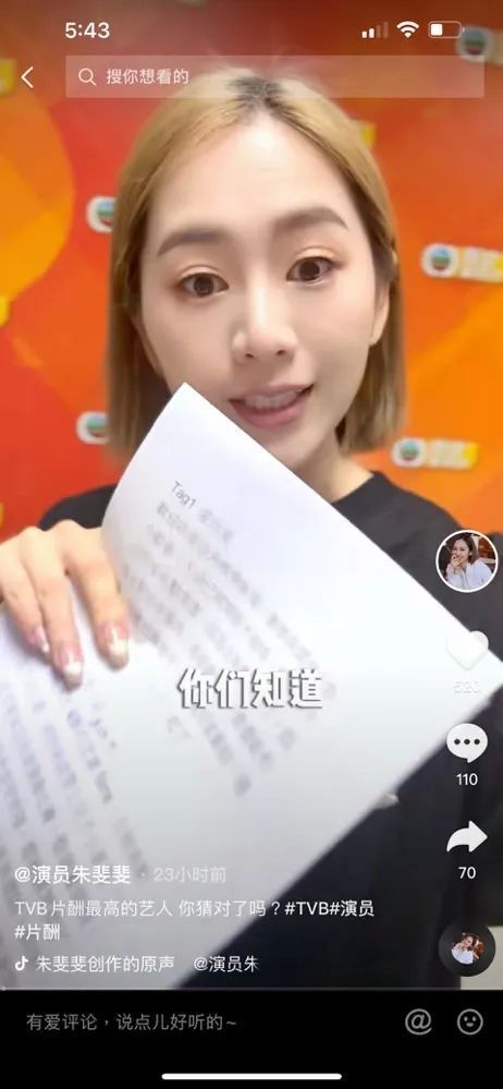 近年来,影视行业不景气,许多小咖艺人都开始转行做自媒体,自曝行业内幕。现年31岁TVB艺训班出身的朱斐斐,不知不觉入行已有11年,参演过的剧集不下80部,去年她开始担任TVB娱乐新闻台主播,但事业发展平平,今年开始她便不时在网上大爆圈中秘事。最近,她就在短视频平台叫网友猜TVB片酬最高的艺人。