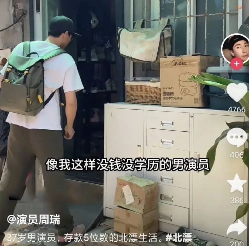 其实,跟她一样,内地娱乐圈也有一名靠自曝行业内幕走红的18线演员周瑞获得不少关注。早前,37岁的演员周瑞在社交平台一连晒出多个视频,分享北漂的生活点滴,调侃自己是十八线男演员,透露存款只有5位数,经常外出拍戏,在北京四合院有一个10平米的小屋。视频中,周瑞展示了10米的小屋,为了扩大空间特意进行精心布置,还养了一只小兔子,17年的北漂生活,已经会做很多美食。周瑞透露,拍戏时剧组会包吃包住,有人帮忙打扫房间,不过,还是喜欢自己的小家,平时也会外出逛街。