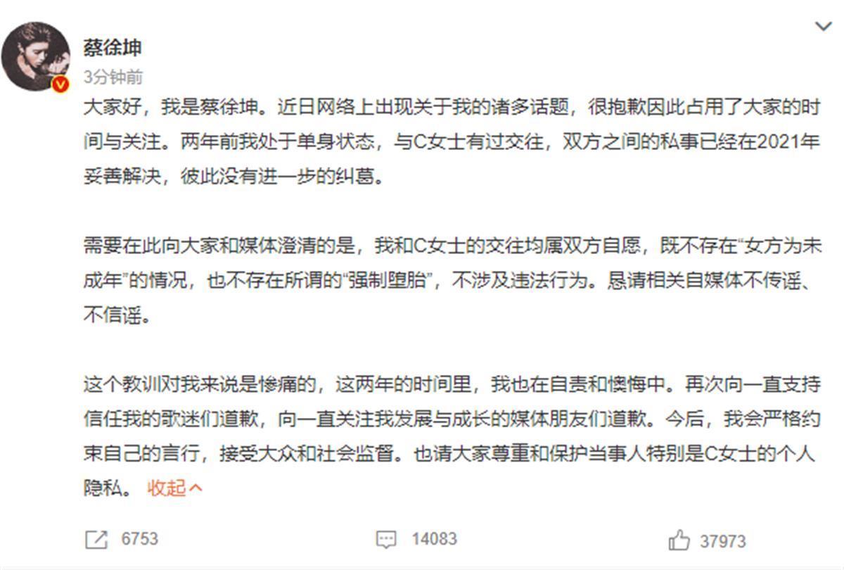 7月3日,小蔡姗姗来迟,在事发一周后,出来 对此事作出了回应,他声称这事发生在两年前,自己是单身,“双方之间的私事已经在2021年妥善解决”,还强调,自己和C女士的交往属“双方自愿”,不存在“女方为未成年”和“强制堕胎”,“不涉及违法行为”。