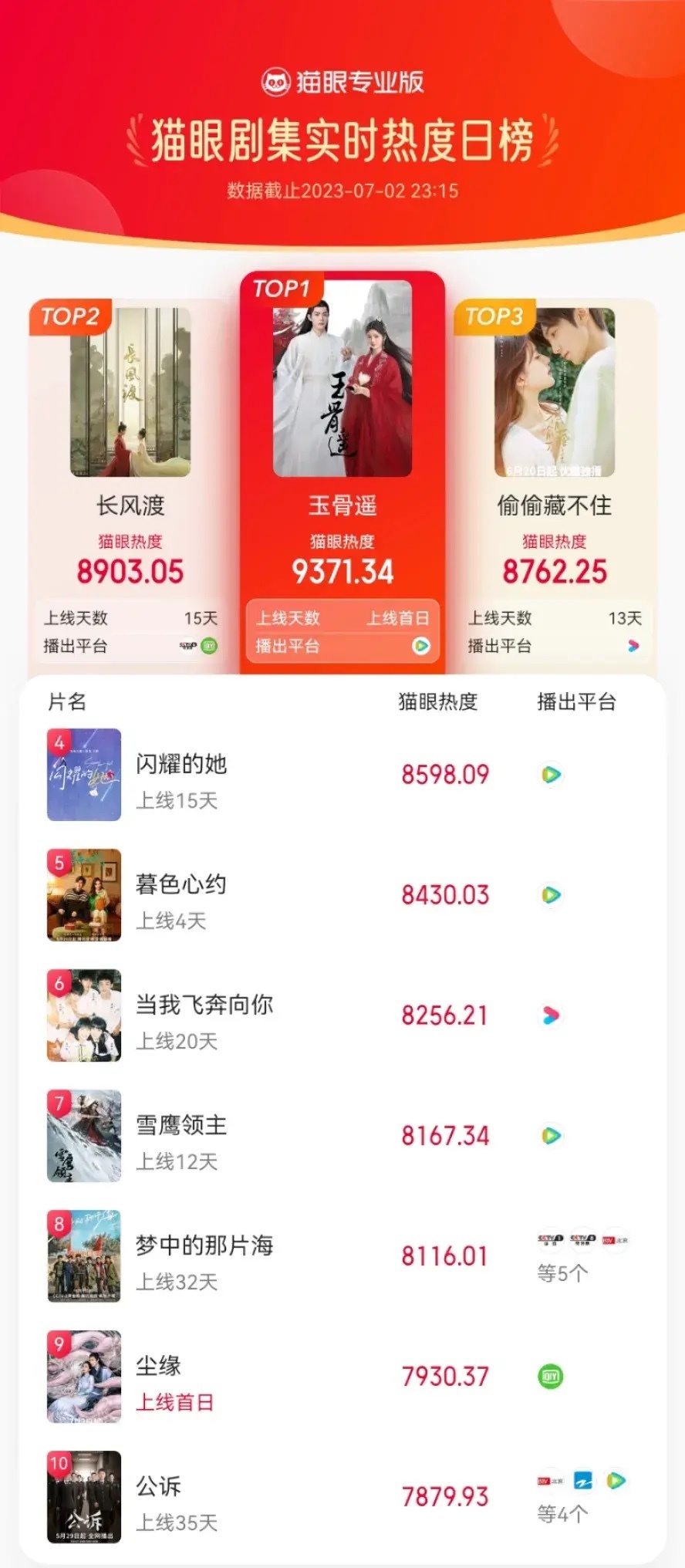 播出后几个小时,站内热度值就破了26000。猫眼全网,《玉骨遥》已经取代《长风渡》成为网络最热的电视剧,真是上线即爆款。