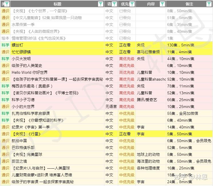 B站我的收藏夹终于等我有空了,打开十几年的好伙伴excel开始做细分,按照类别(英语,科学,通识分类),然后评上优先级(高,中,低。先看高优先级的),写上备注。我估计娃全部看完得到上小学了!(今年刚幼儿园小班)