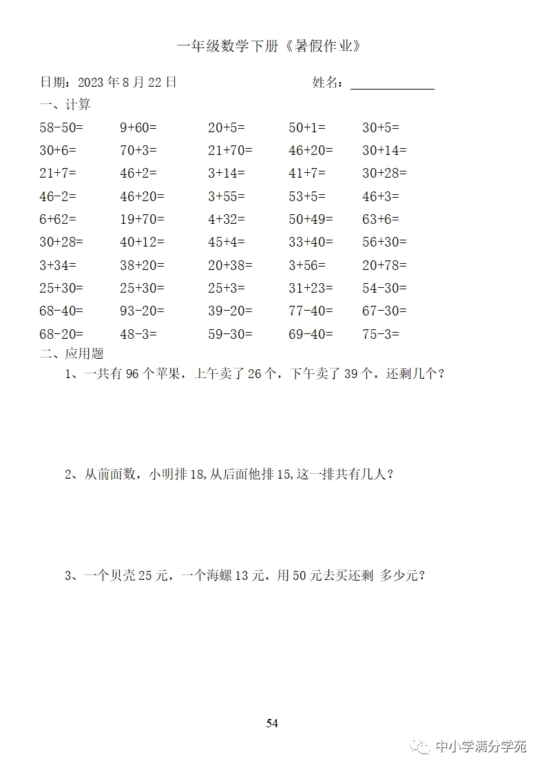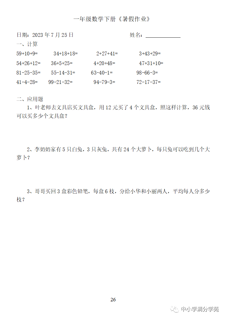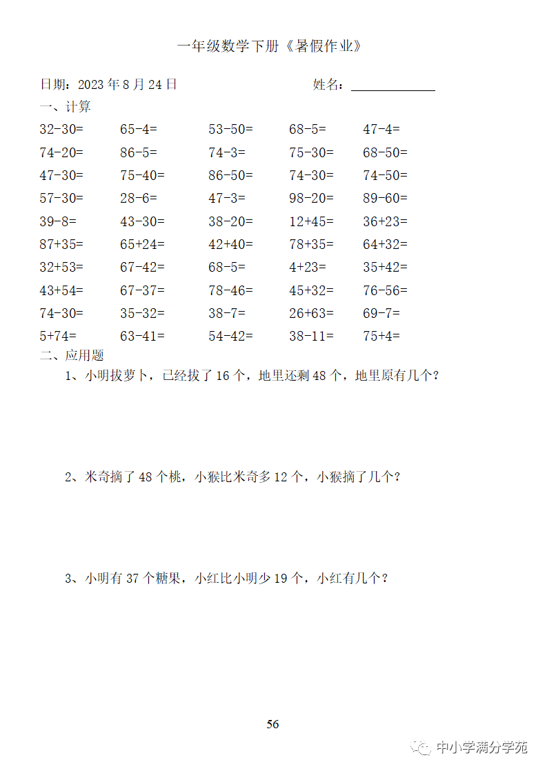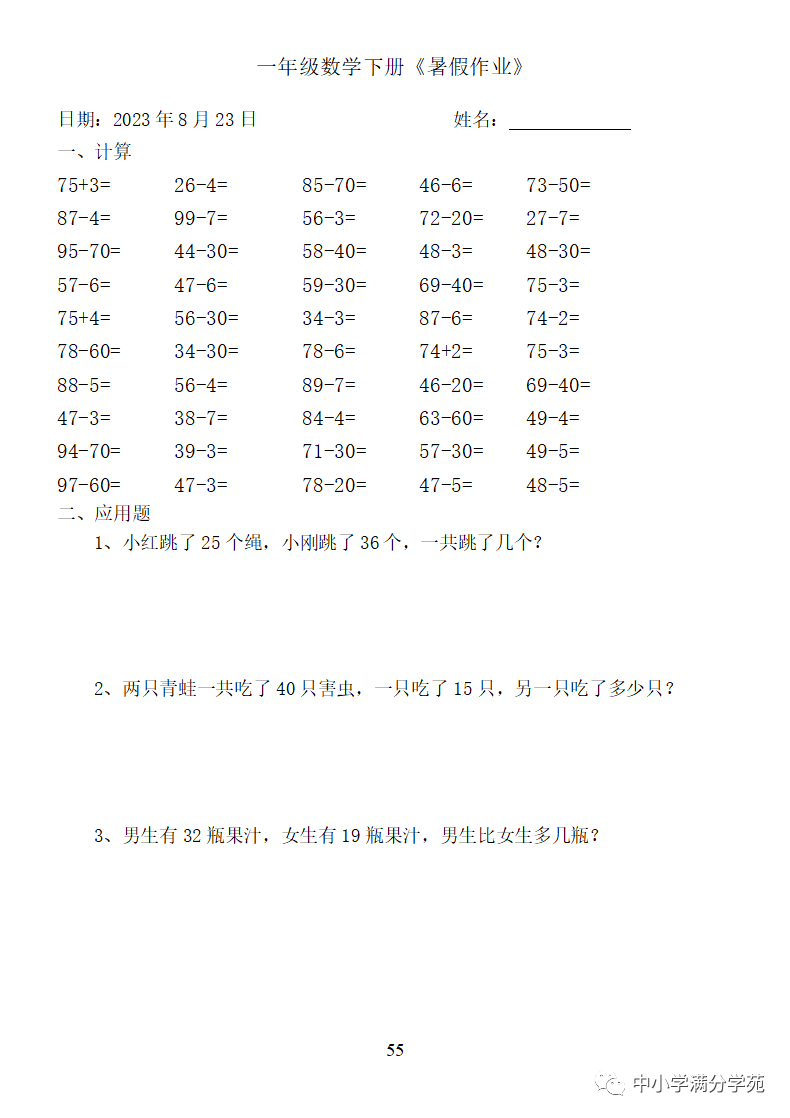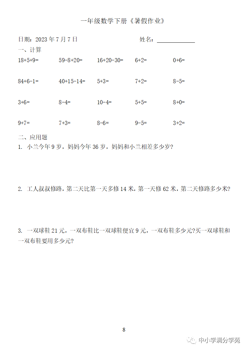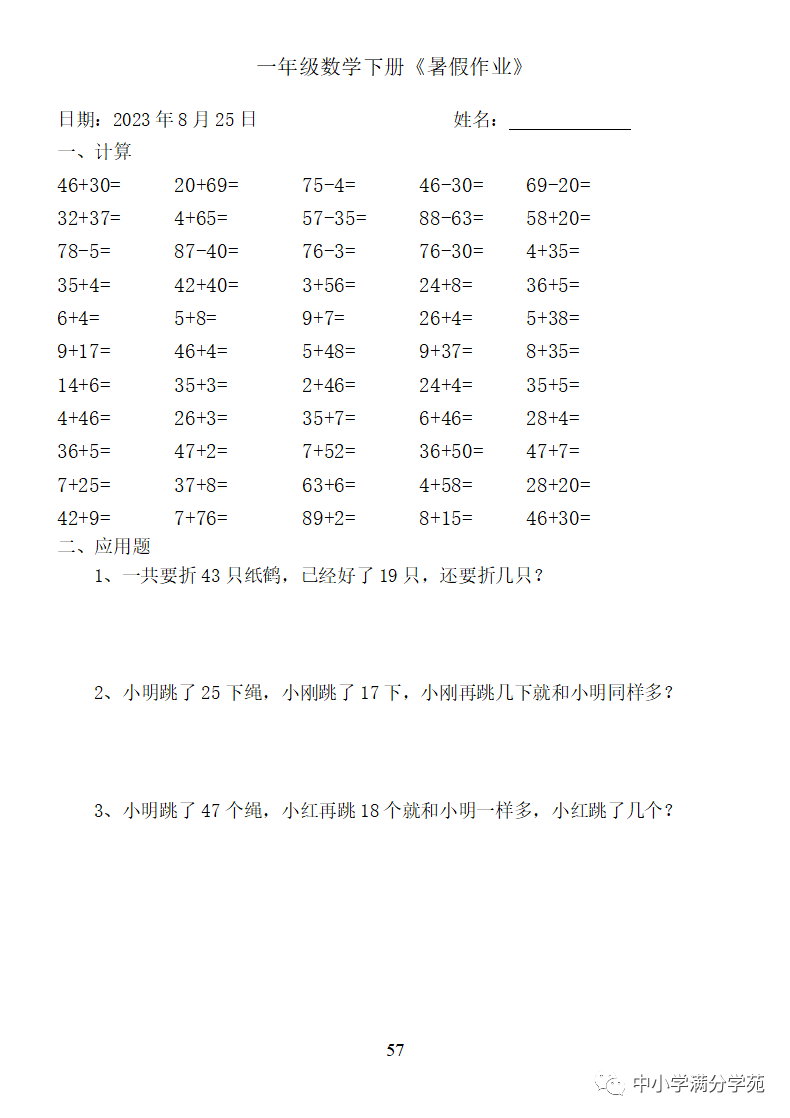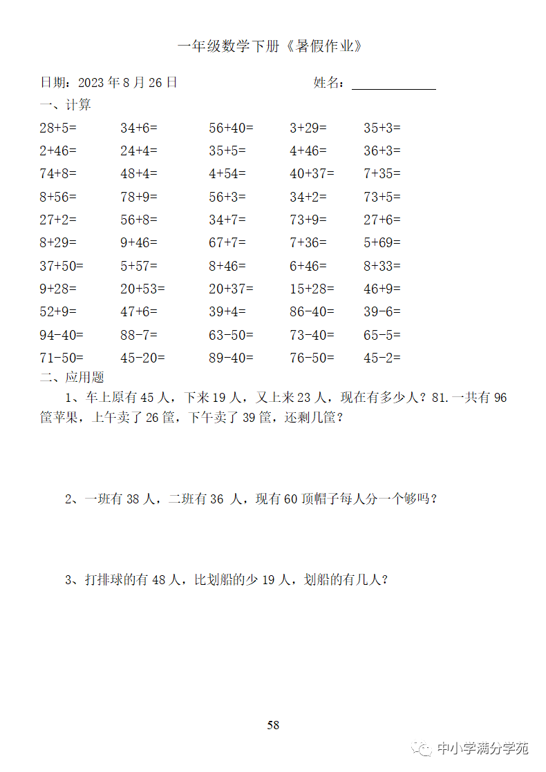 手机访问:wap.265xx.com一年级数学下册:《暑假作业》全58套(口算、应用题),可下载