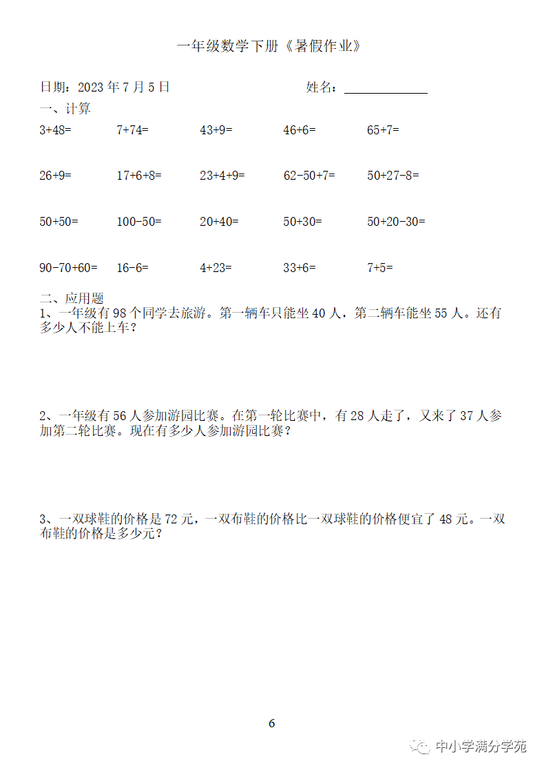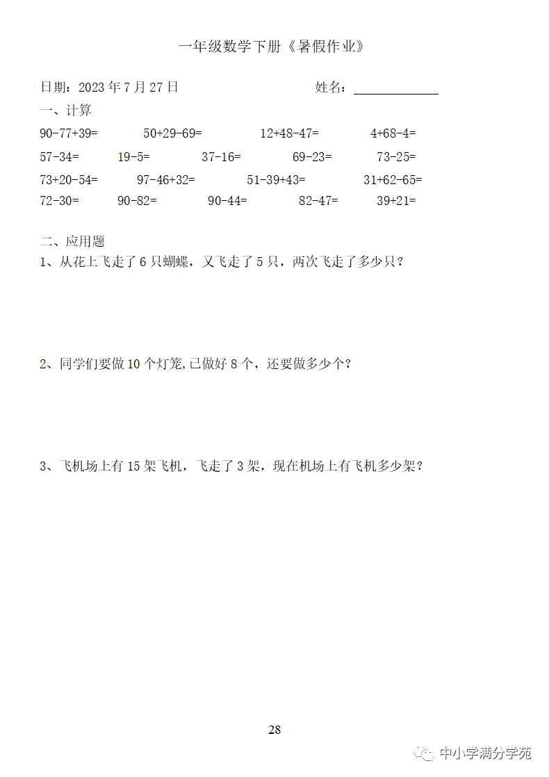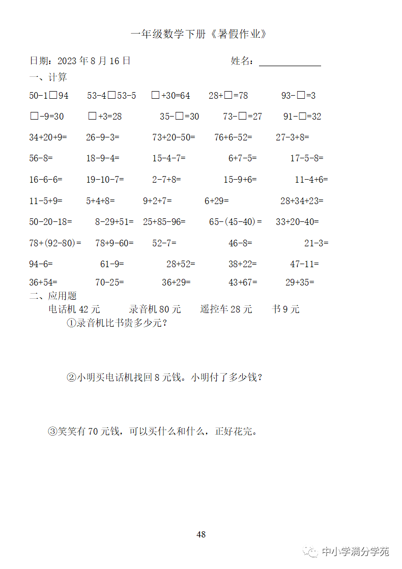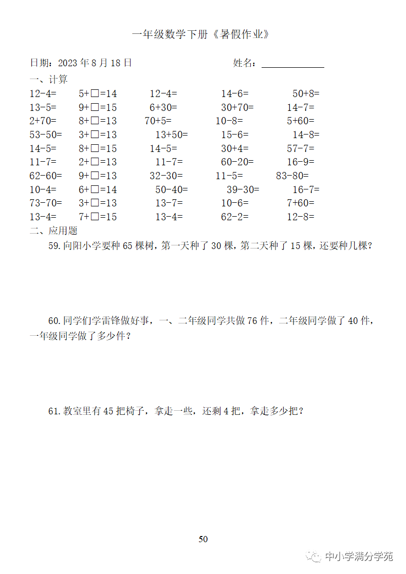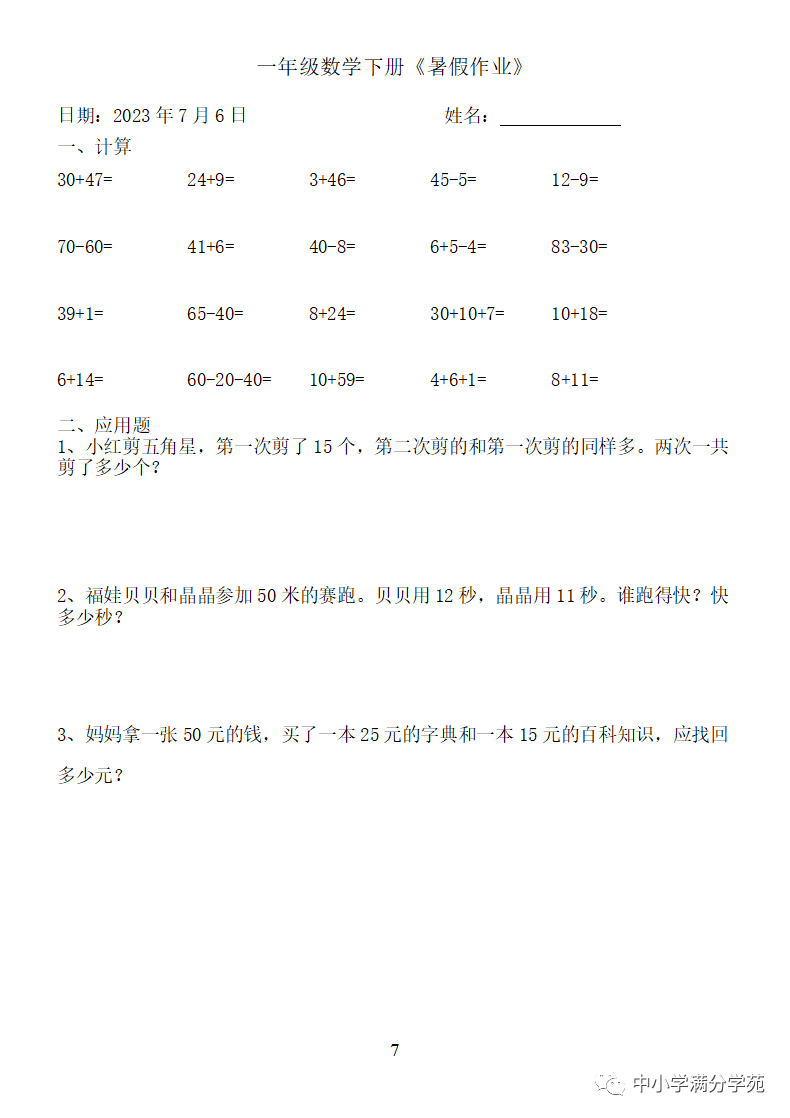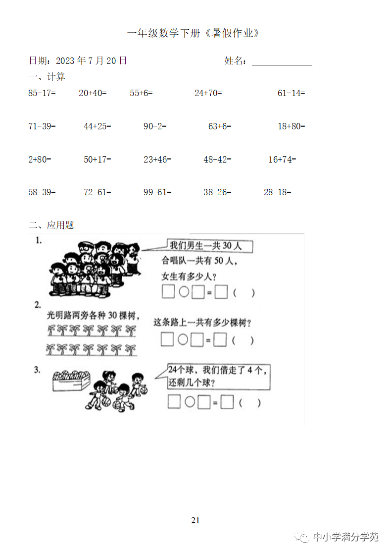 手机访问:wap.265xx.com一年级数学下册:《暑假作业》全58套(口算、应用题),可下载