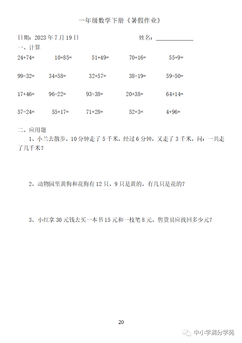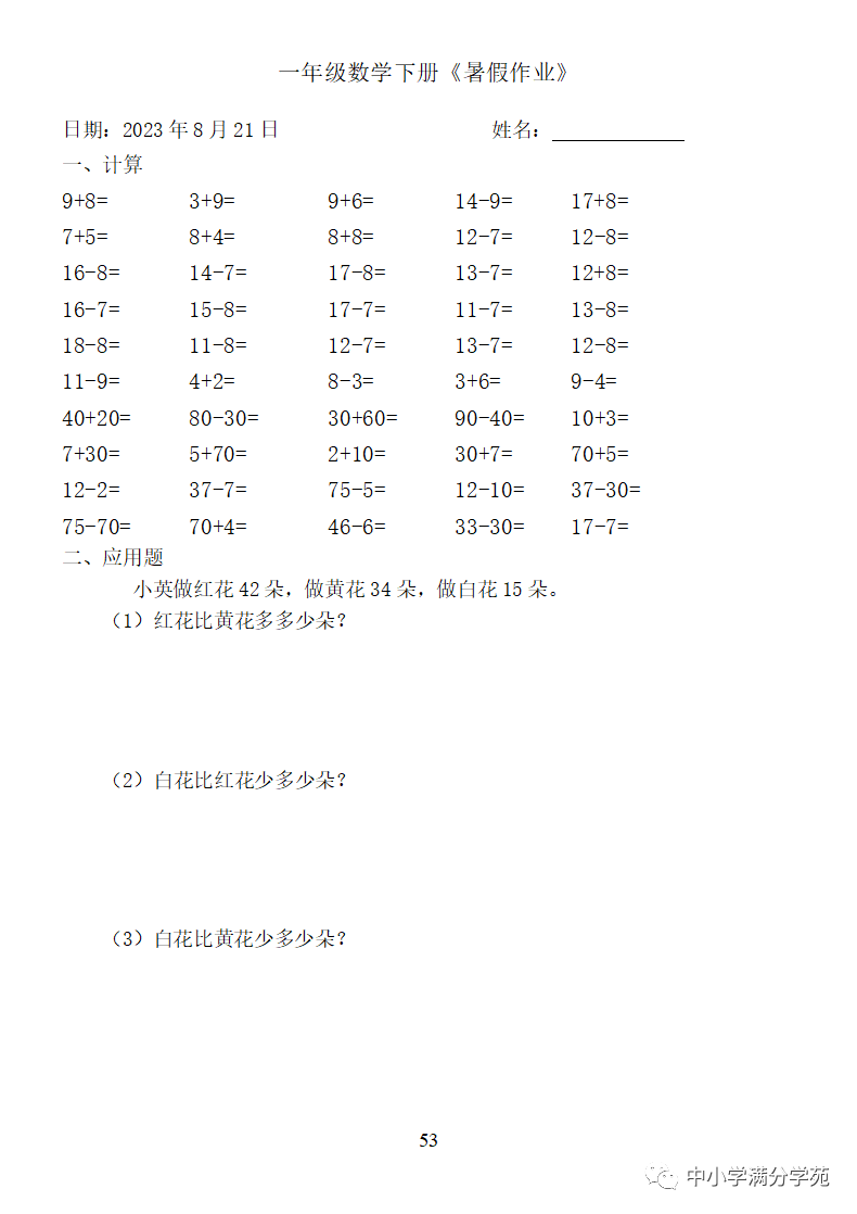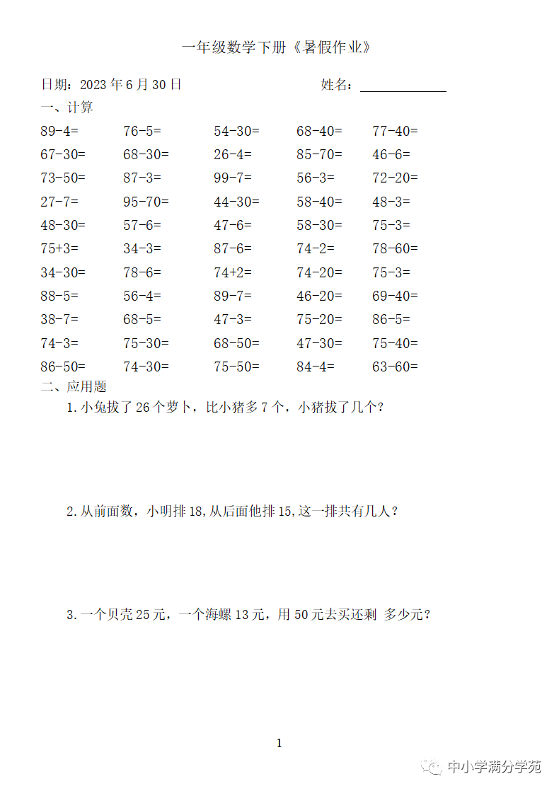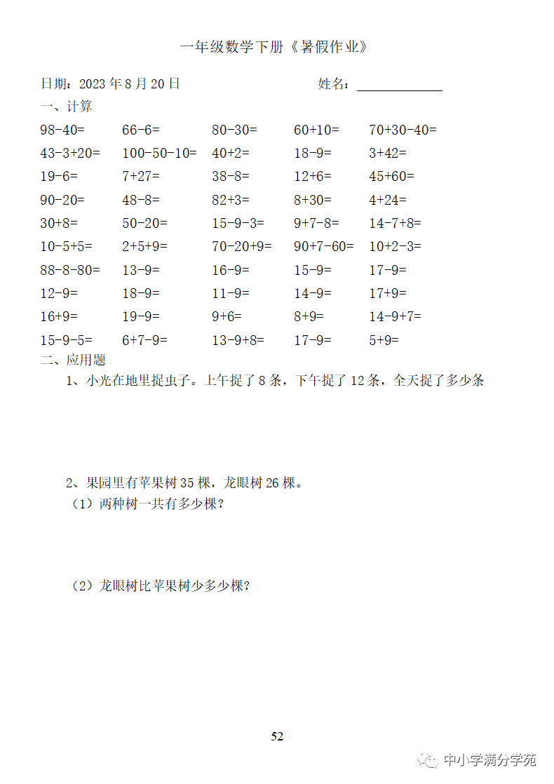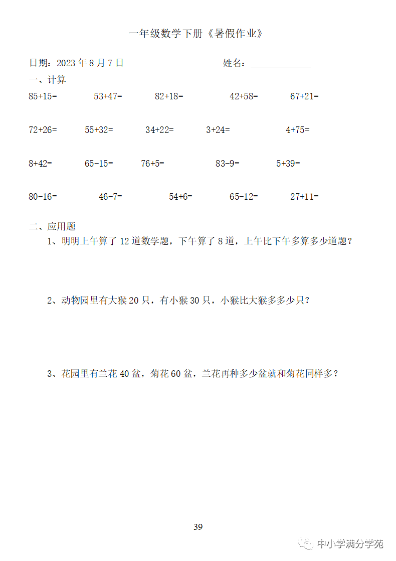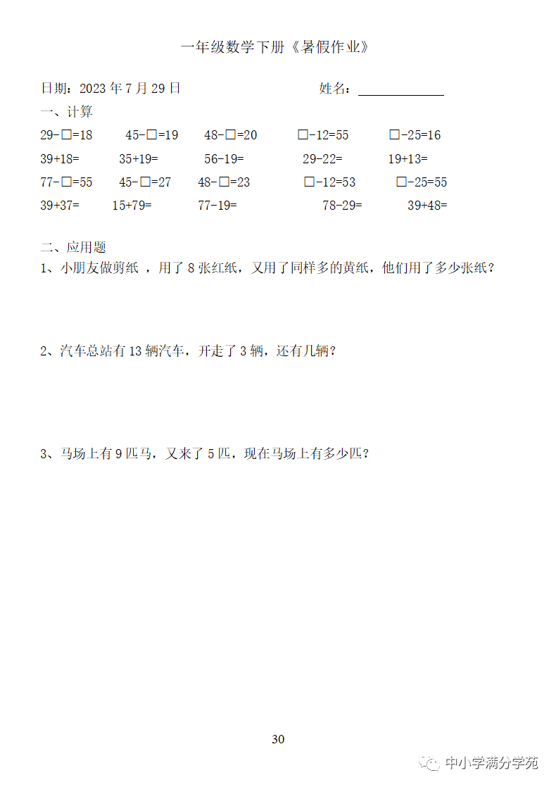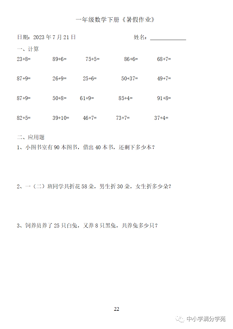 手机访问:wap.265xx.com一年级数学下册:《暑假作业》全58套(口算、应用题),可下载