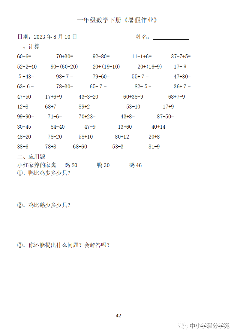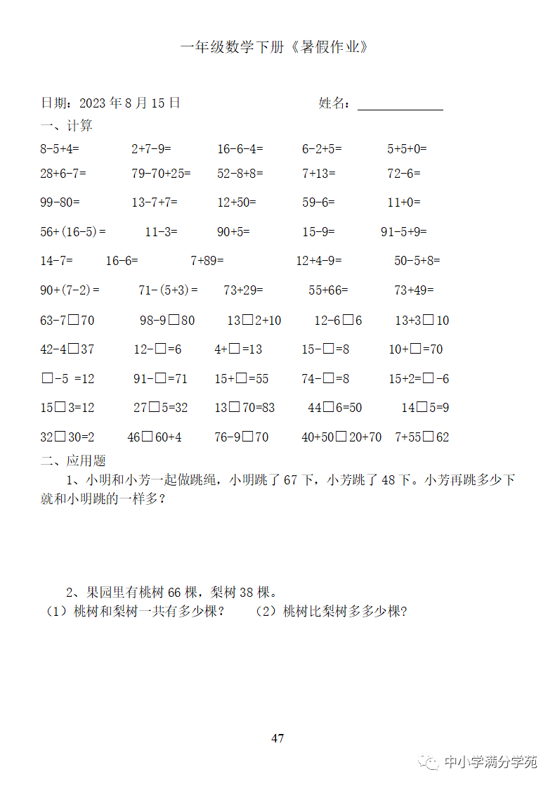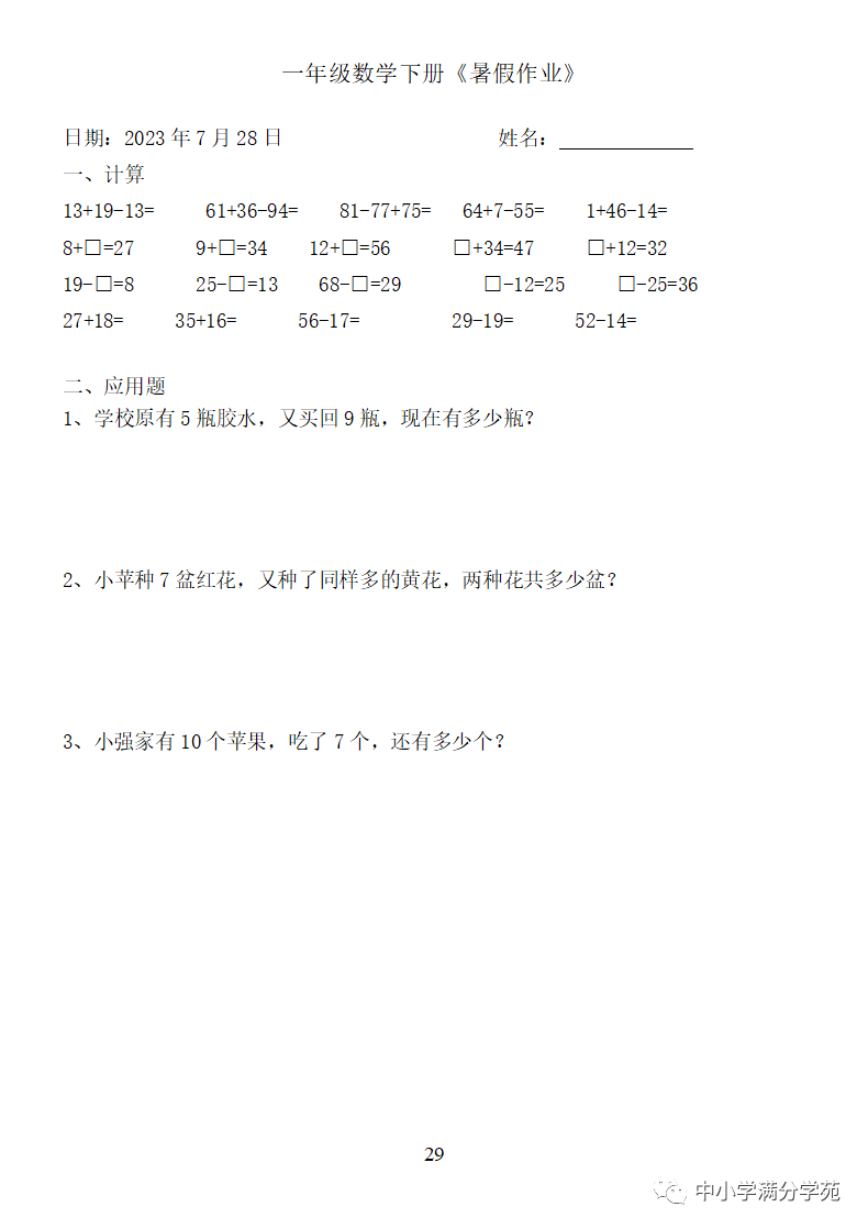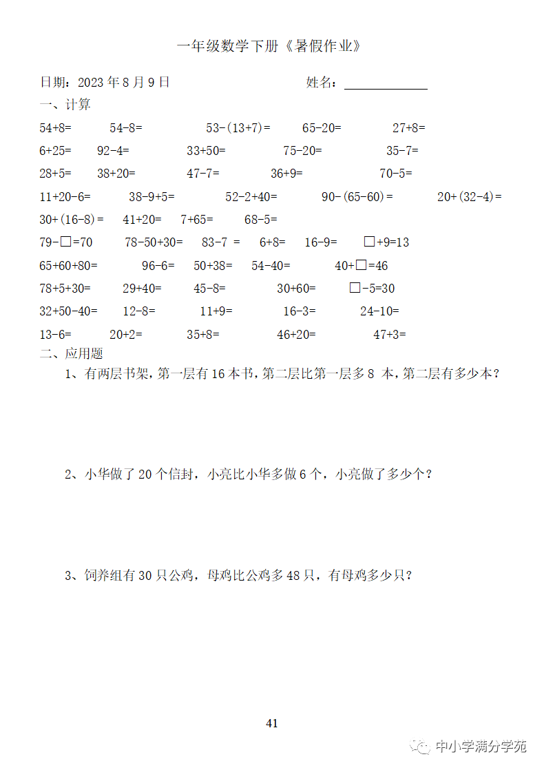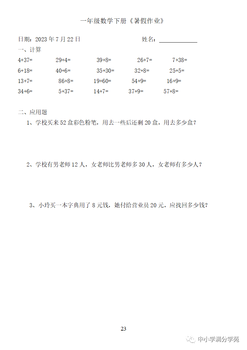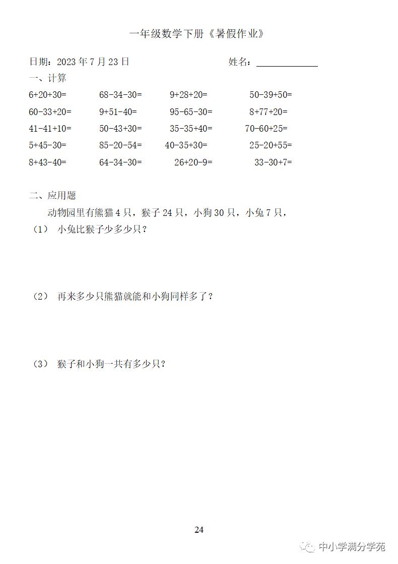 手机访问:wap.265xx.com一年级数学下册:《暑假作业》全58套(口算、应用题),可下载