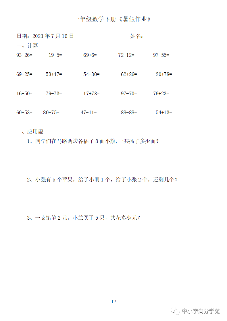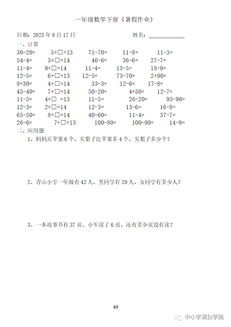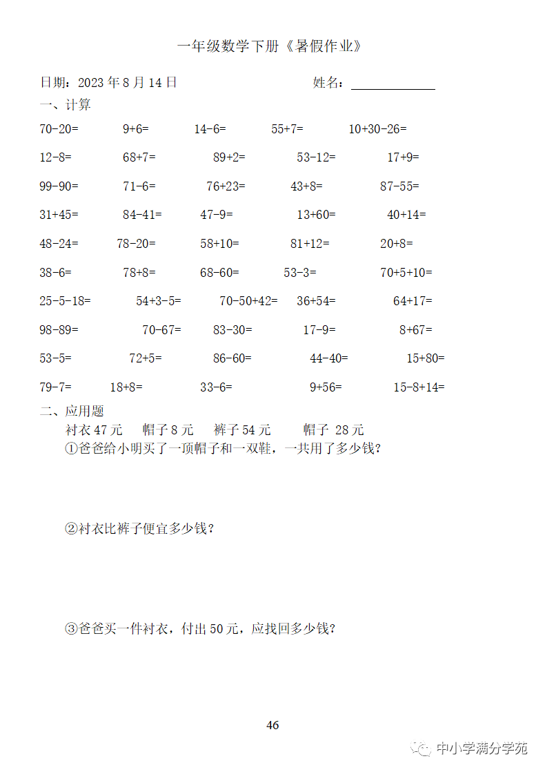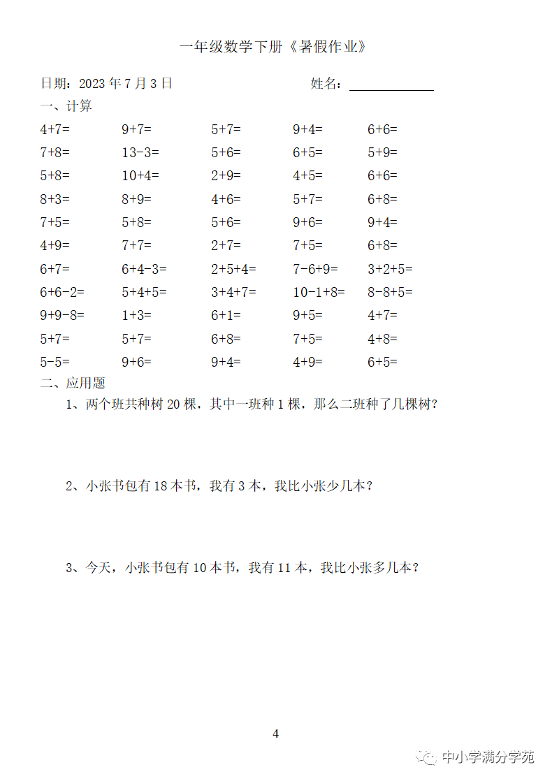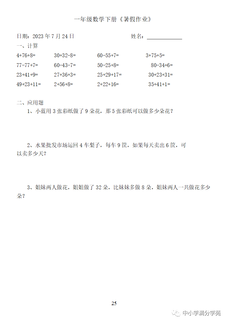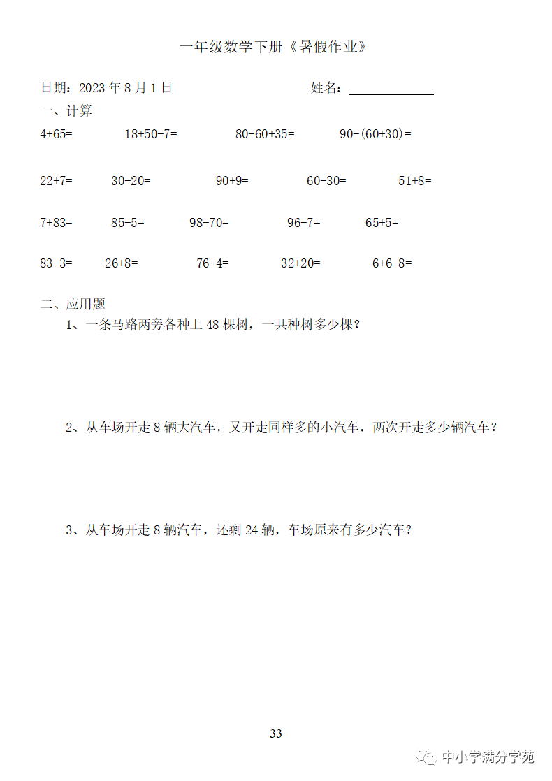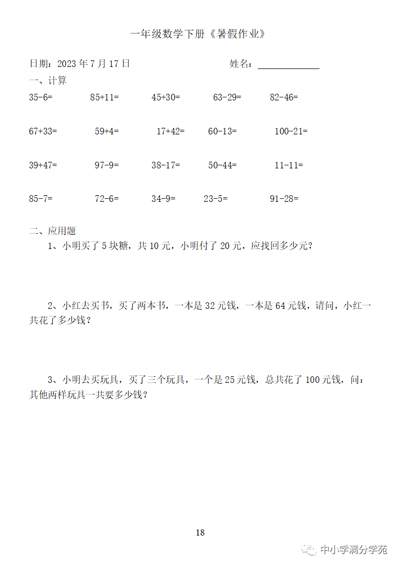 手机访问:wap.265xx.com一年级数学下册:《暑假作业》全58套(口算、应用题),可下载