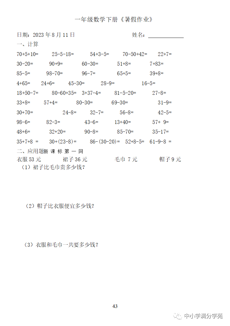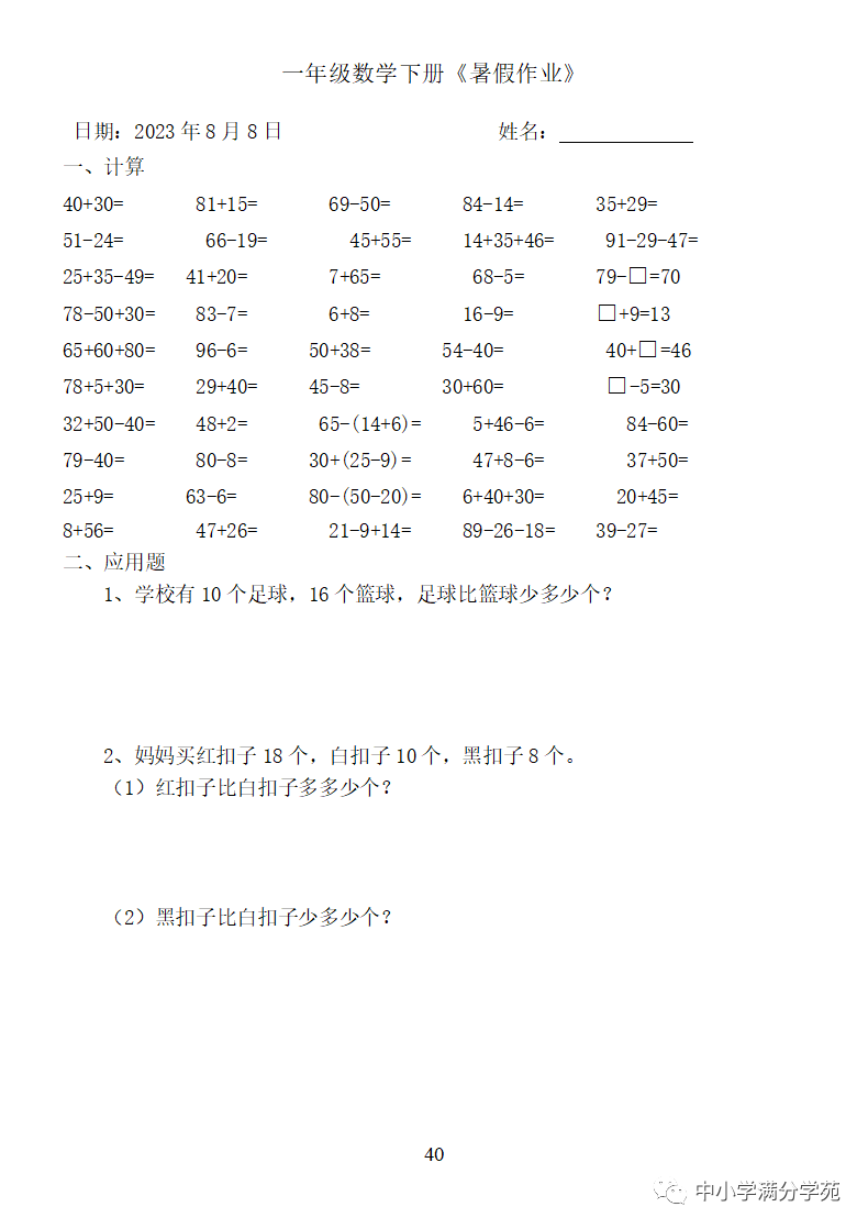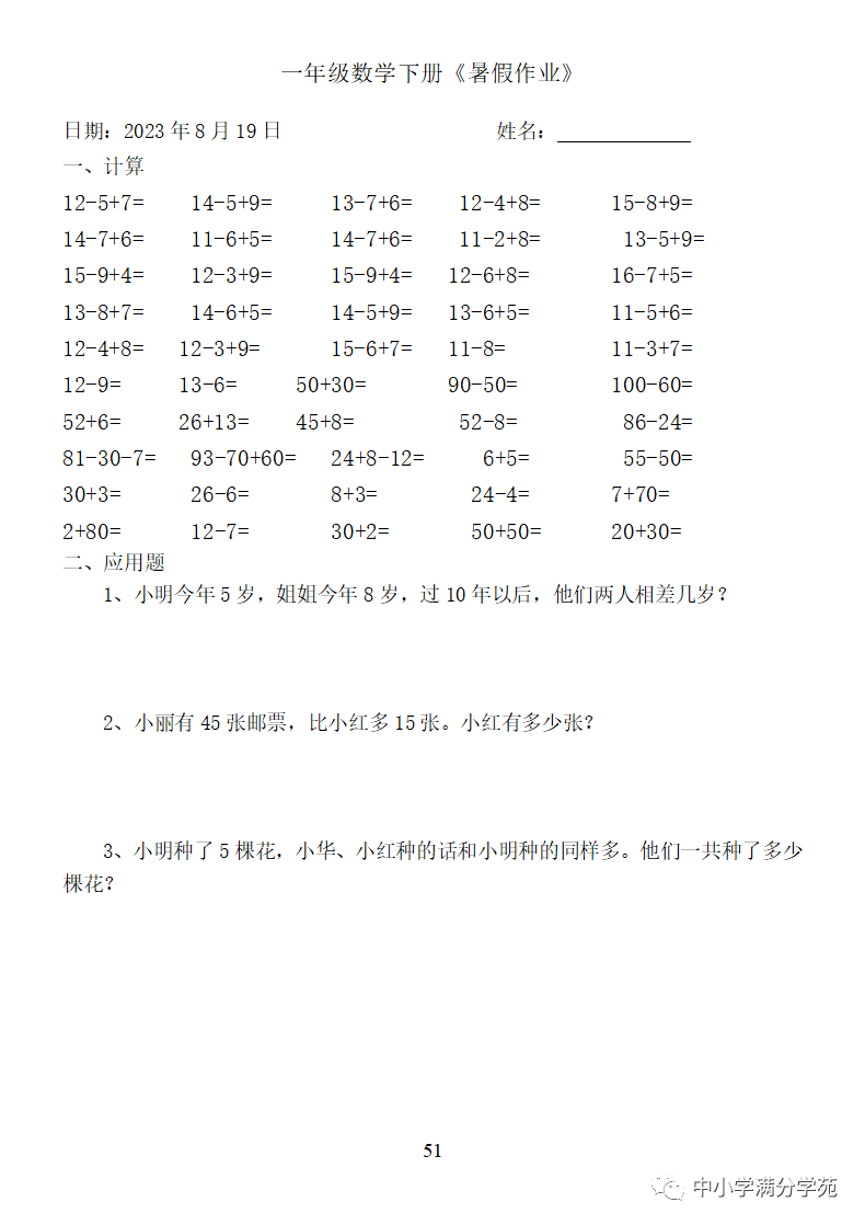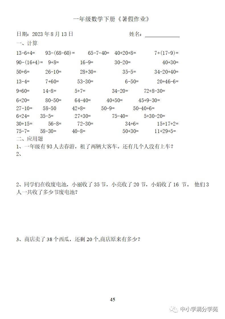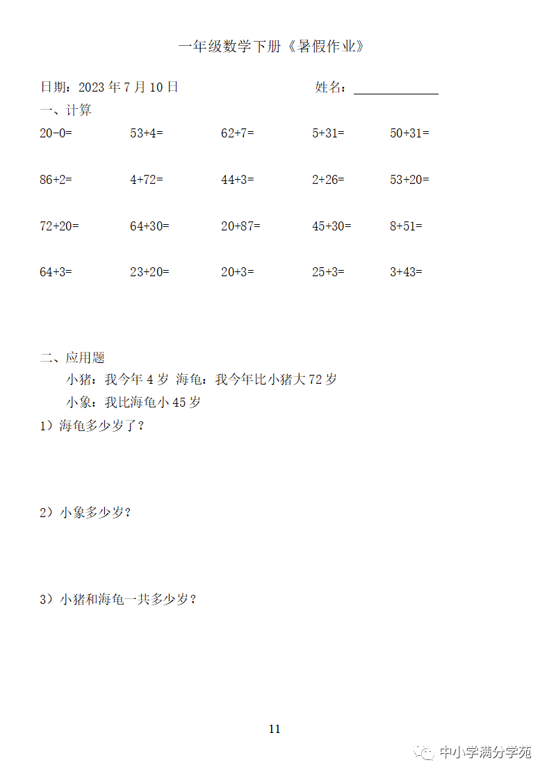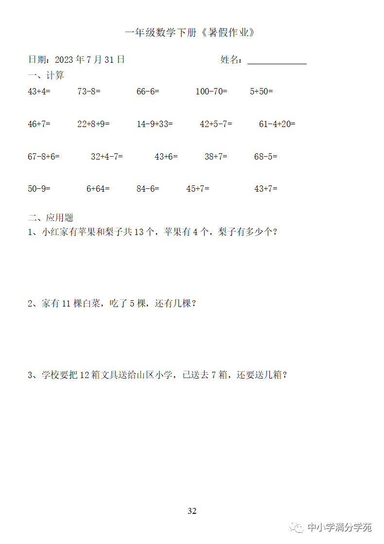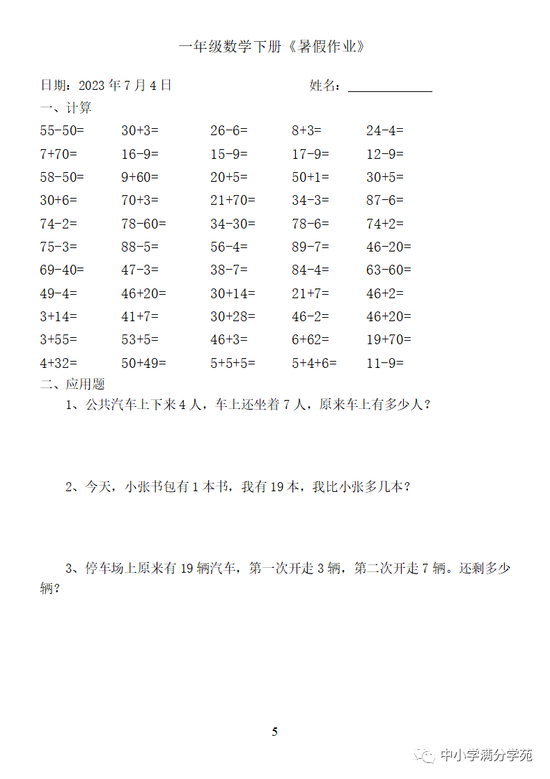 手机访问:wap.265xx.com一年级数学下册:《暑假作业》全58套(口算、应用题),可下载