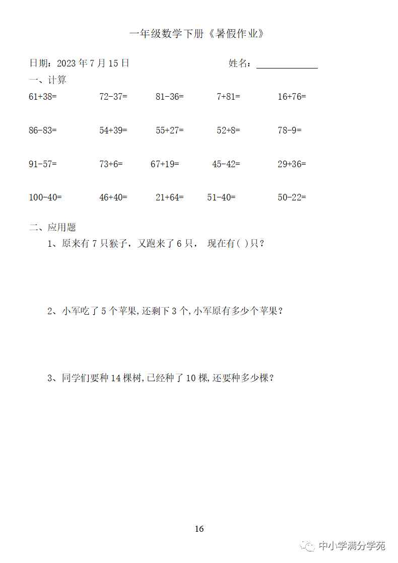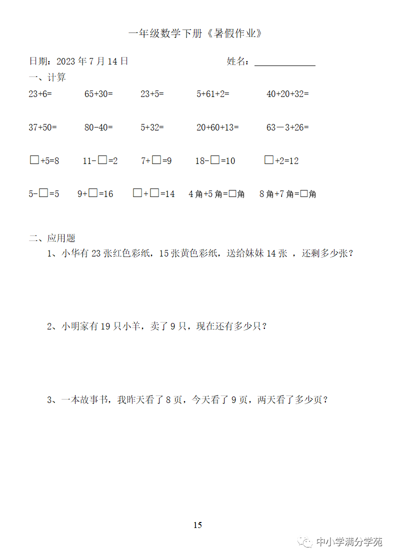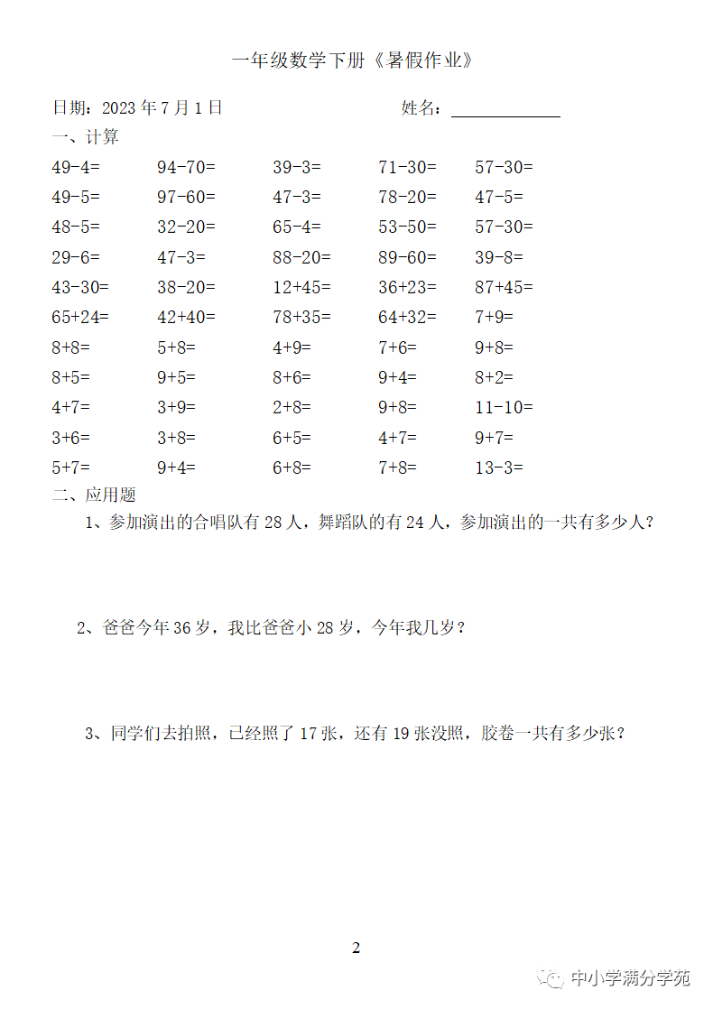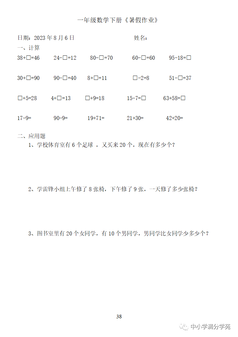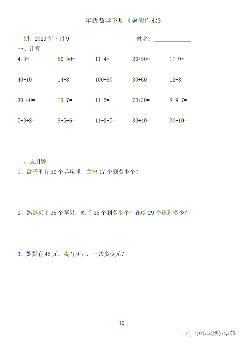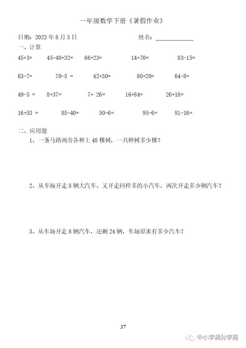 手机访问:wap.265xx.com一年级数学下册:《暑假作业》全58套(口算、应用题),可下载
