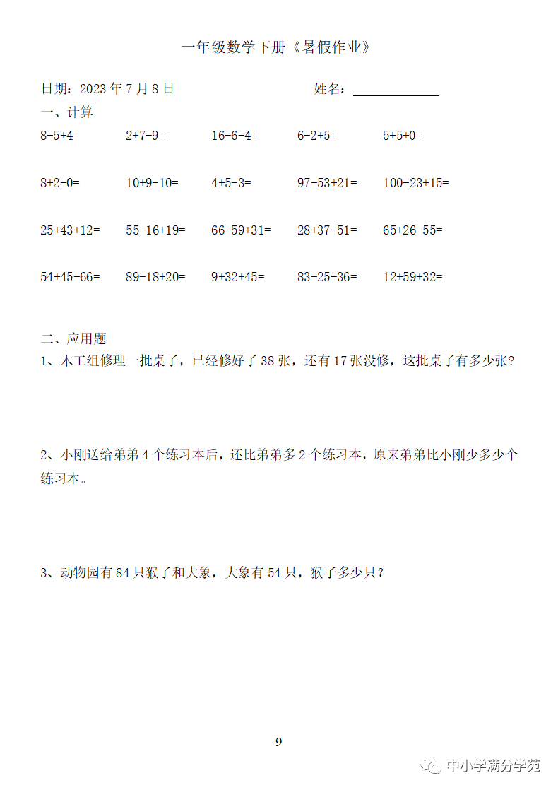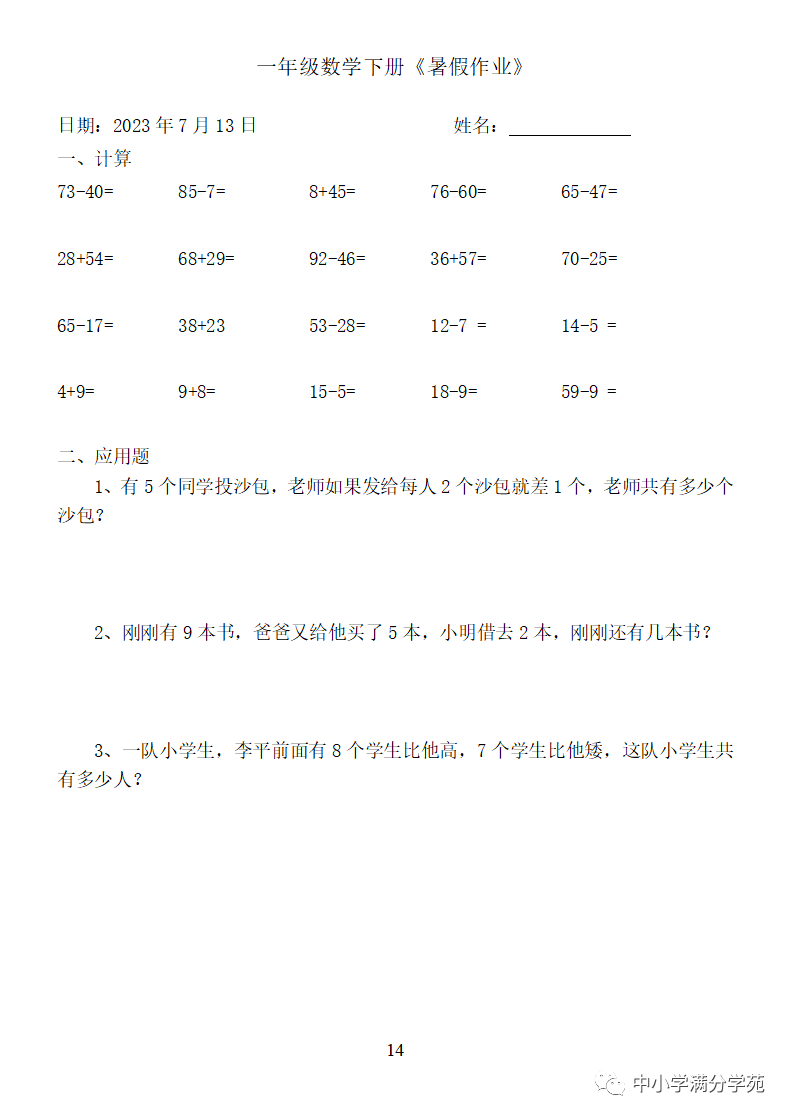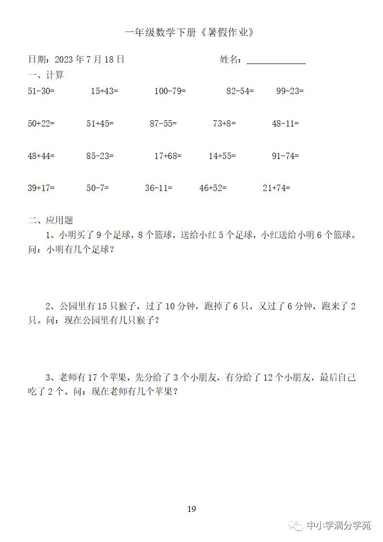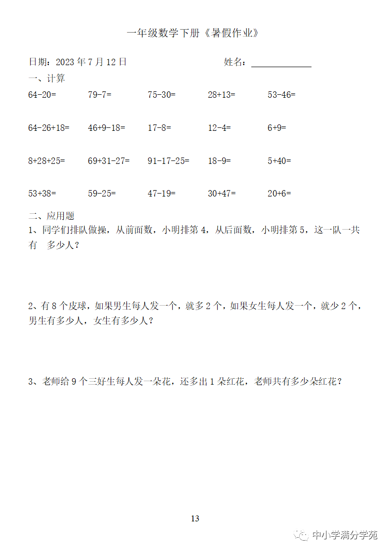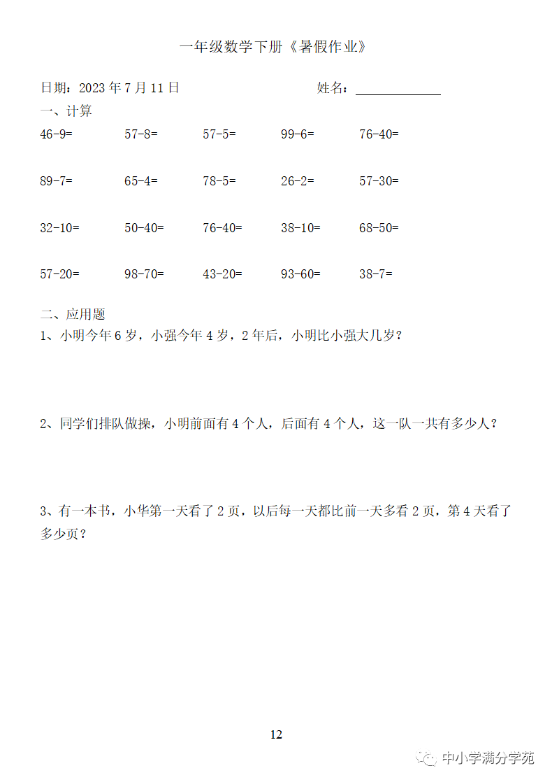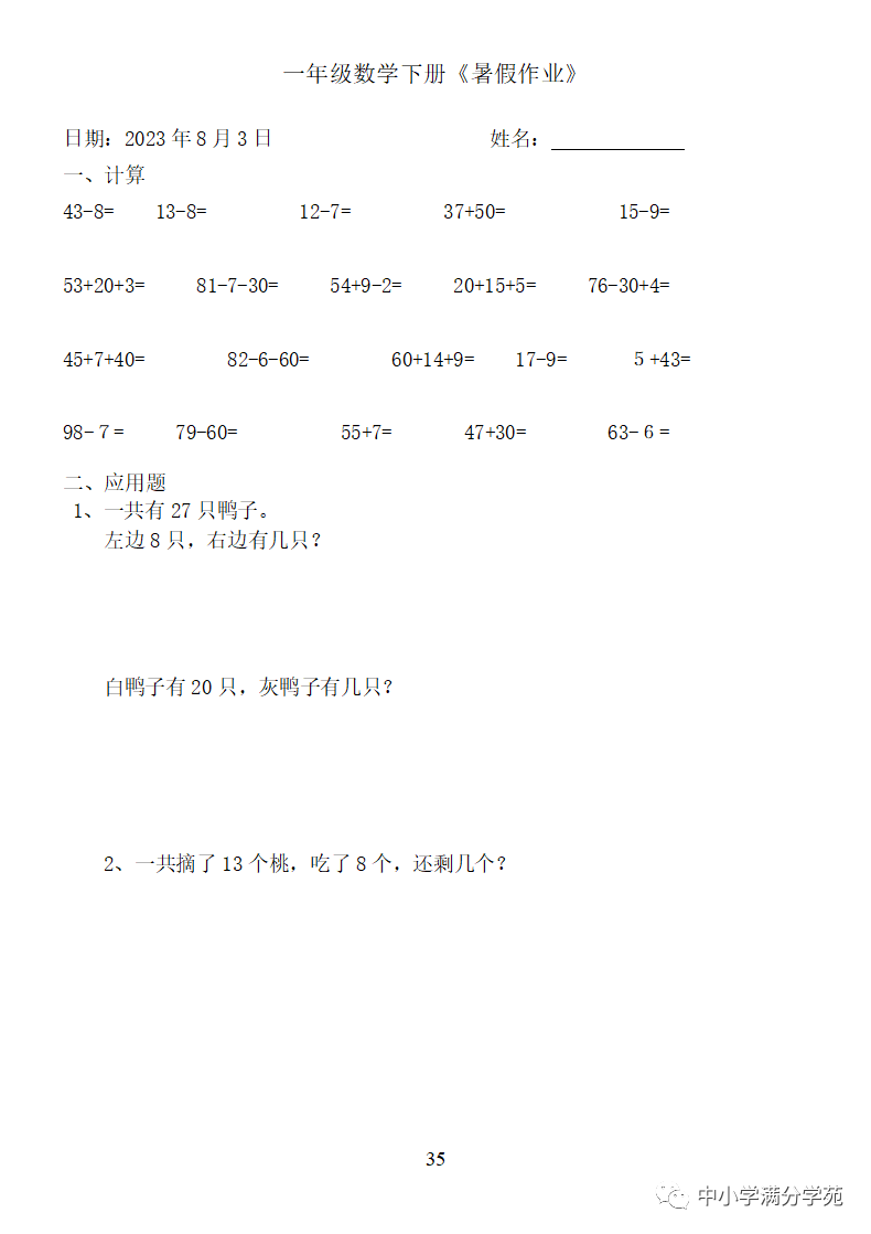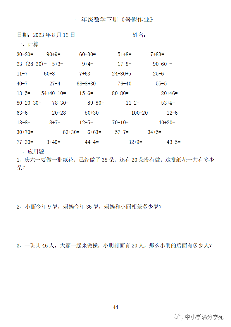 手机访问:wap.265xx.com一年级数学下册:《暑假作业》全58套(口算、应用题),可下载