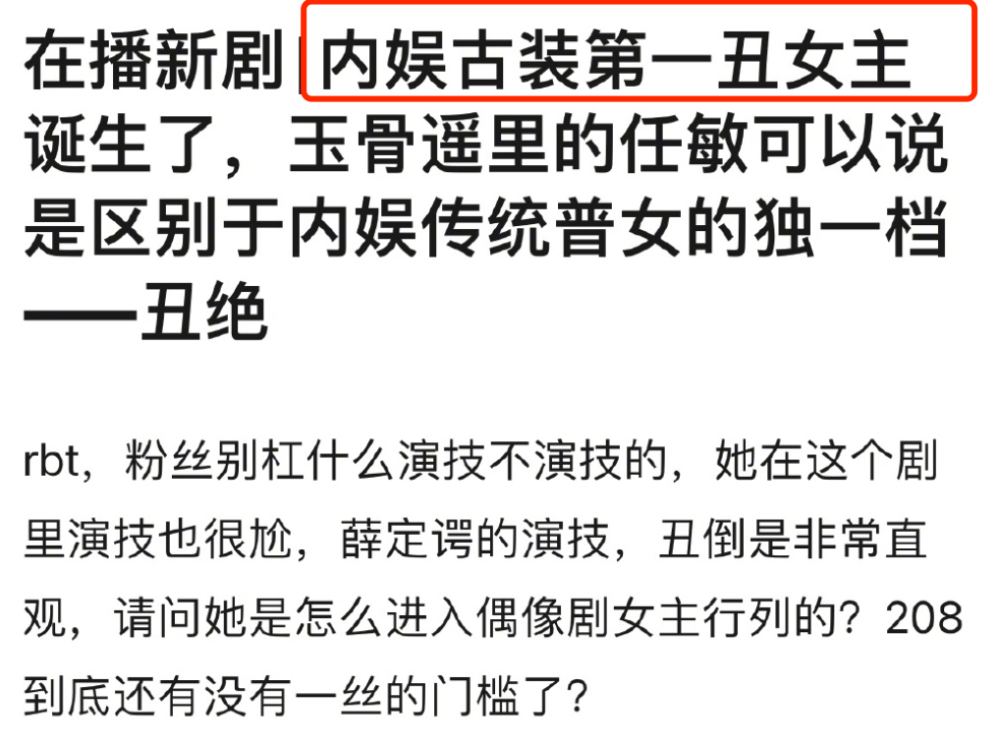 原因只有一个:女主角任敏也太难看了!而且在“女主难看”这一点上,广大网友达到了惊人的共识。