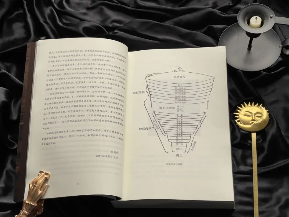 地狱是一个上宽下窄的九层漏斗,从地球穿到地心到达地球的另一边,再攀爬炼狱山;七层炼狱则像一座山,下面宽大,越往上越狭窄,对应的《圣经》里的七宗罪。