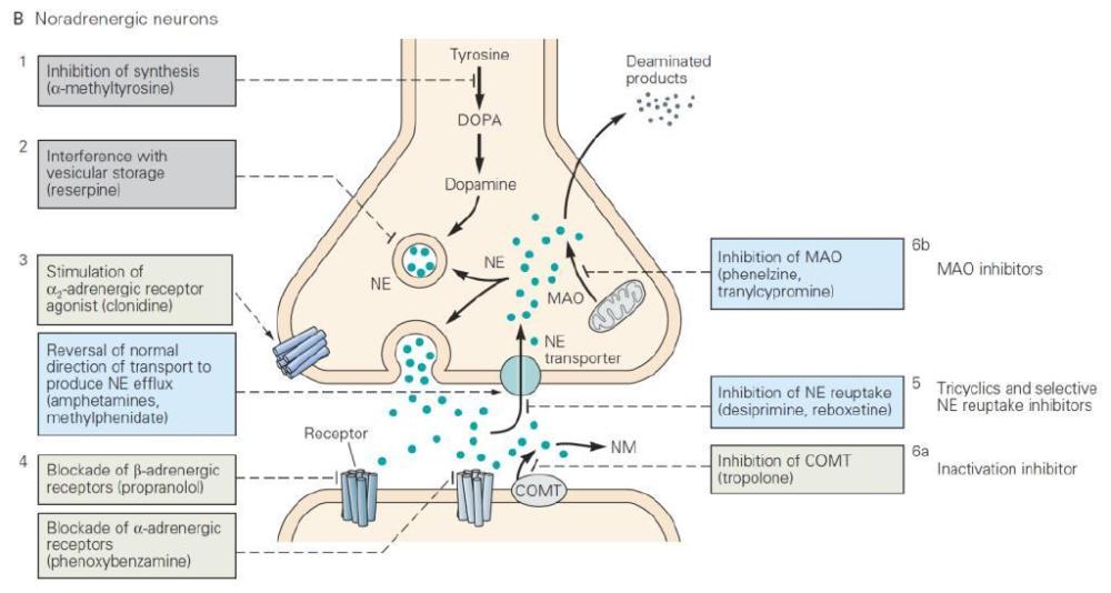正常生理情况下,为了使突触后神经元能够连续不断地感应来自突触前神经元的动作电位,已从突触前神经元释放的神经递质在完成信号传导后,必须及时高效地从突触间隙被清除。由于神经递质通过扩散离开突触间隙的速度较慢,神经系统还有两种快速清除神经递质的机制,要么动用突触间隙中的特异性代谢酶来原位降解?(例如MAO就是负责降解单胺类神经递质的氧化酶),要么通过突触前神经元或者神经胶质细胞质膜上的特异转运蛋白来回收?(图6)。