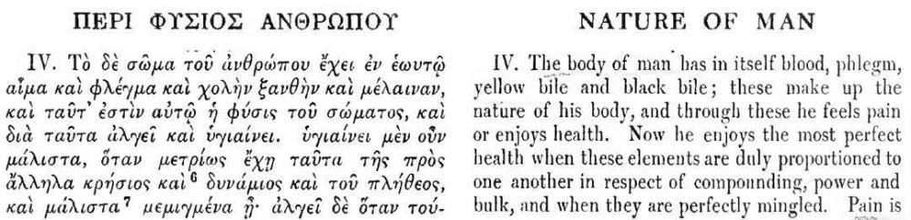 远在两千五百年前,古希腊医学之父希波克拉底?(Hippocrates of Kos)?和其著名后辈盖伦?(Galen of Pergamon)?分别倡导了影响西方医学界近两千年的四体液学说?(The Four Humors Theory)。希波克拉底认为人有四种体液:血液?(sanguine)?、黄胆汁?(choleric)?、黑胆汁?(melancholic)?和黏液?(phlegmatic),健康是各种体液相互谐调的结果,如果体液混合错误就会生病,而治疗要领就是要使体液恢复和谐的状态?(图1)。盖伦进一步将四体液学说应用到临床,将人的脾气体质分为四类:黄胆质者勇敢精力充沛、黑胆质者固执忧郁、多血质者热情果断、黏液质者愚笨懒惰。盖伦将炎症也分为四种:来自血液之蜂窝组织炎、来自黄胆汁之丹毒、来自黏液之水肿、来自黑胆汁之癌瘤。他甚至将该学说用于发烧的分类:属血的持续热、属黄胆汁的三日热、属黏液的每日热、属黑胆汁的四日热。