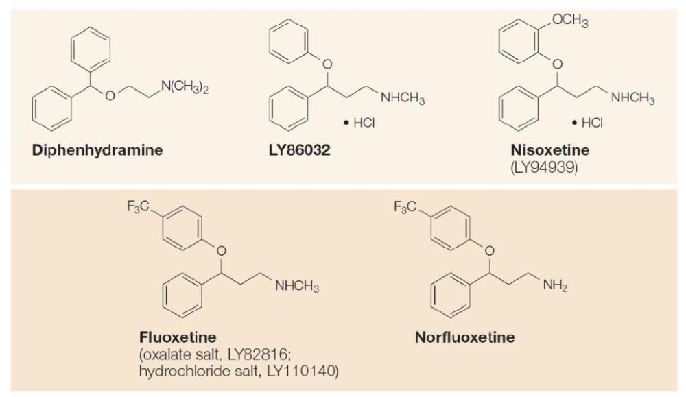 从1971年开始,美国礼来制药公司?(Eli Lilly)?的研究人员开始致力于研制比TCA类药物更具特异性的选择性神经递质回收抑制剂?(selective reuptake inhibitors, SRI)?,通过区分不同的单胺递质系统而增强抗抑郁药物的安全性能和病人对药物的耐受力。他们先合成了一种名为Nisoxetine?(LY94939)?的仲胺化合物,在体外细胞生化实验中,它能高选择性地抑制去甲肾上腺素的回收。