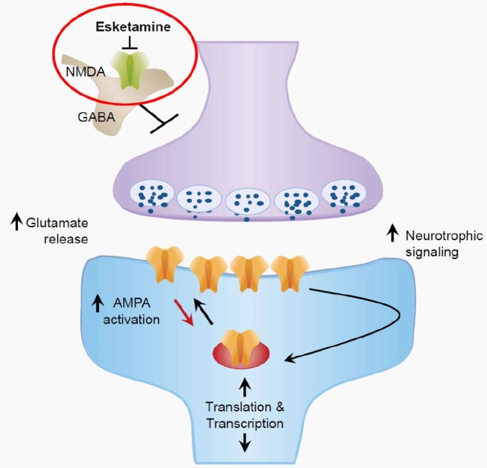 艾氯胺酮比较粗略的分子机制是:通过拮抗谷氨酸的NMDA受体,促进谷氨酸的释放,激活突触后神经元的AMPA受体。AMPA受体激活可以增强神经营养因子的信号传导,进而产生快速且可以持续的抗抑郁疗效?(图12)。但这些初步认识离我们透彻理解氯胺酮的作用机理尚有距离。近年来很多科研团队都在深入探究,以求找到能消除艾氯胺酮不良性质的新药。目前至少有五种不同的假说,学术界在短期内很难达成全面共识。总之,与人类大脑健康休戚相关的抗抑郁药研发依然任重而道远。